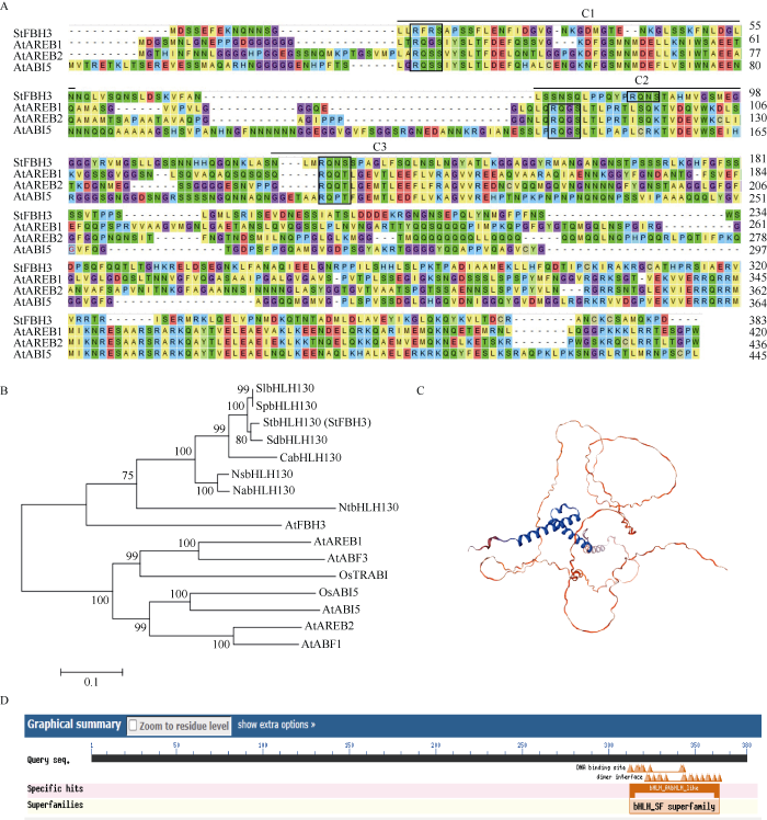 将拟南芥基因AtFBH3 (AT1G51140)序列提交至Phytozome数据库进行对比, PGSC0003DMT400021062的bitscore最高, 为77.9295, identity为86%, 故将其命名为StFBH3, 并用于后续研究。StFBH3基因全长2580 bp, 含有6个外显子和5个内含子。提取‘Desiree’叶片的RNA并反转录为cDNA, 以该cDNA为模板对StFBH3进行克隆并测序, 序列分析表明该序列与参考序列一致。