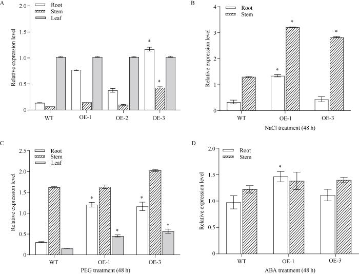 为了进一步研究StFBH3在干旱、高盐和ABA胁迫下的表达模式, 将野生型和过表达植株分别置于含有10% PEG-6000、100 mmol L-1 NaCl和50 µmol L-1 ABA的1/2 MS培养基中, 分别处理0 h和48 h。提取植株不同部位的RNA, 并逆转录为cDNA, 进行qPCR分析。在盐处理48 h后, StFBH3在所有过表达马铃薯株系根和茎中的表达量均上调; 其在OE-1根中的表达量约为对照的1.3倍, 茎中的表达量约为对照的3.2倍, 均呈显著水平(图2-B)。在PEG处理48 h后, StFBH3在所有过表达马铃薯株系根、茎和叶片中的表达量均上调, 其中OE-1和OE-3根和叶片中StFBH3相对表达量较野生型呈显著水平(图2-C)。在ABA处理48 h后, StFBH3在所有植株的根和茎中的表达量均上调, 其中OE-1根中StFBH3相对表达量较野生型显著上调, 约为对照的1.6倍(图2-D)。表明高盐、渗透和ABA胁迫均不同程度地影响StFBH3基因的表达, 其中根对胁迫处理表现得更为敏感。由此推测StFBH3可能参与响应脱水、高盐、渗透和ABA激素等胁迫。