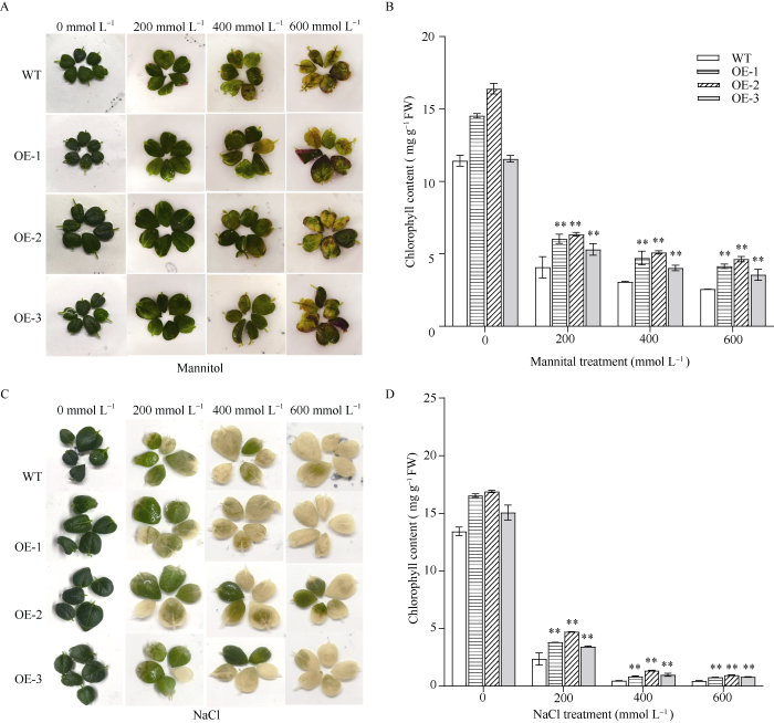 A和C: 不同浓度甘露醇和盐处理下, 过表达马铃薯株系与野生型植株叶片的表型; B和D: 不同浓度甘露醇和盐处理下, 过表达马铃薯株系与野生型植株叶片中叶绿素含量。**表示在0.01概率水平差异显著。