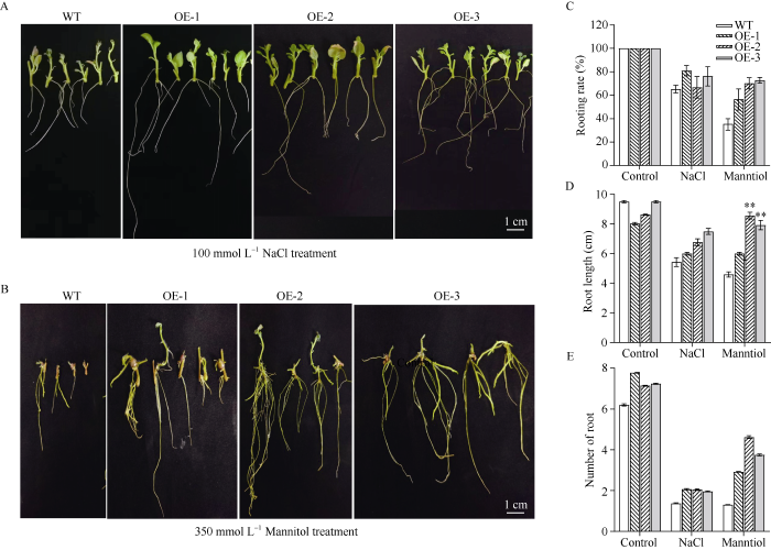 A-B: morphology of potato lines under 100 mmol L-1 NaCl and 350 mmol L-1 mannitol; C-E: rooting rate, the main root length and root numbers of potato lines under 100 mmol L-1 NaCl and 350 mmol L-1 mannitol. Bar: 1.0 cm; ** indicates a significant difference at the 0.01 probability level.