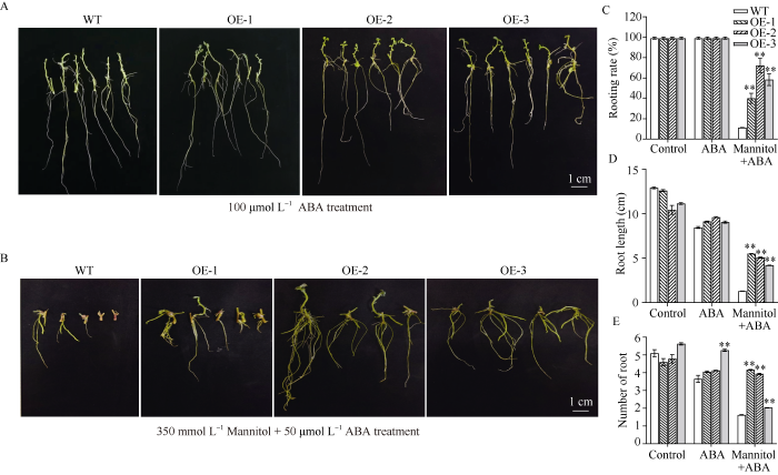 A: morphology of potato lines under 100 µmol L-1 ABA; B: morphology of potato lines under 50 µmol L-1 ABA and 350 mmol L-1 mannitol; C-E: rooting rate, the main root length and root numbers of potato lines under two conditions. Bar: 1.0 cm; ** indicates a significant difference at the 0.01 probability level.