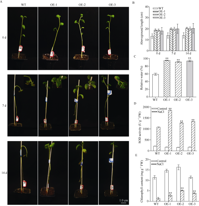 A: 马铃薯植株在盐胁迫下的表型; B: 在盐胁迫下, 马铃薯株系地上部位的长度; C: 在盐胁迫下, 马铃薯株系叶片的相对含水量; D: 在盐胁迫下, 马铃薯株系叶片中SOD酶活性分析; E: 在盐胁迫下, 马铃薯株系的叶绿素含量测定。标尺为1.0 cm; **表示在0.01概率水平差异显著。