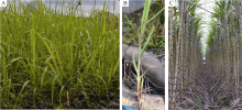 不同种源果蔗苗及后期生长状态 A: 第一代脱毒组培果蔗种苗; B: 第一代脱毒果蔗的种茎培育获得的萌芽种苗; C: 收获期果蔗。"