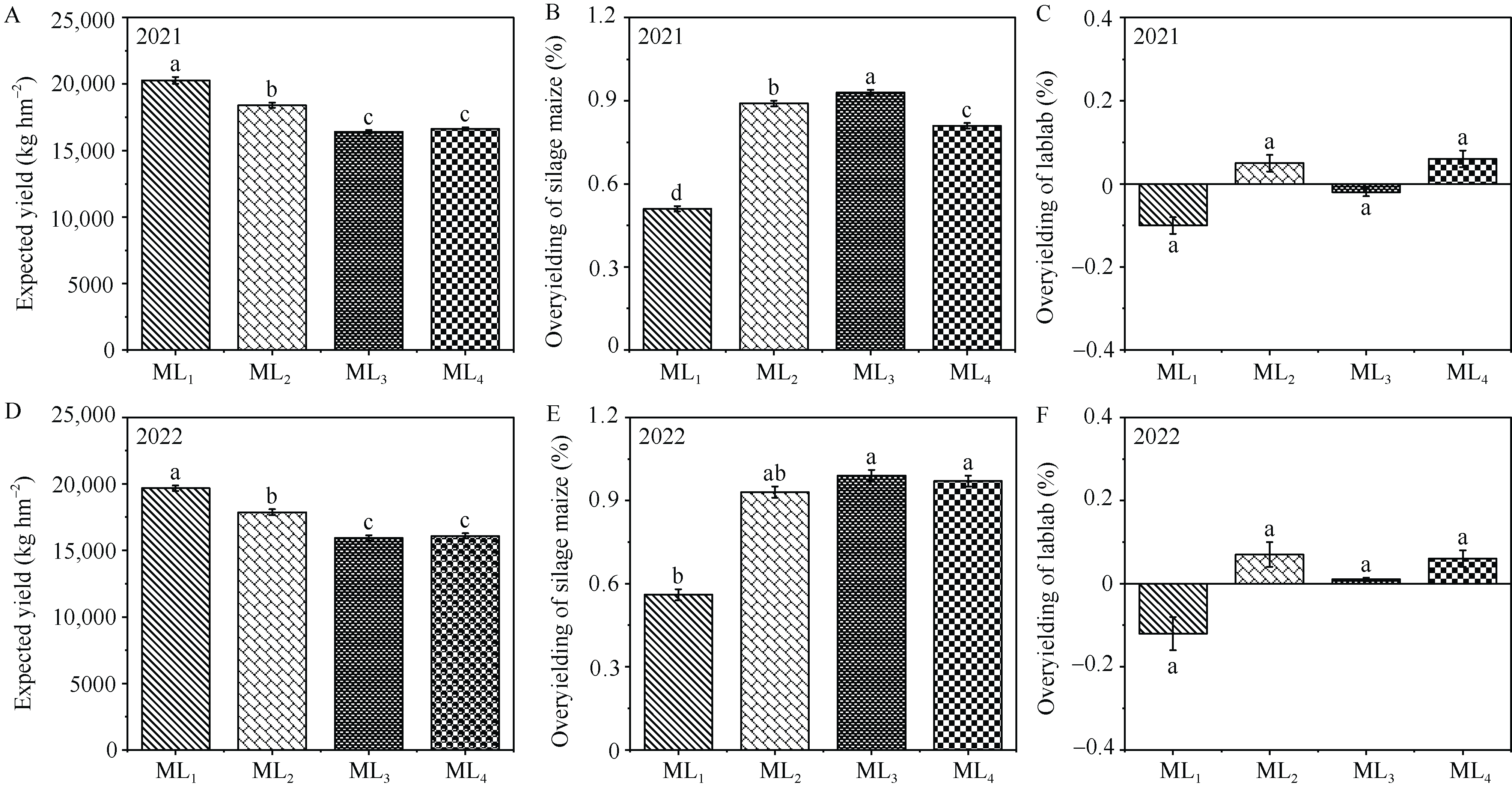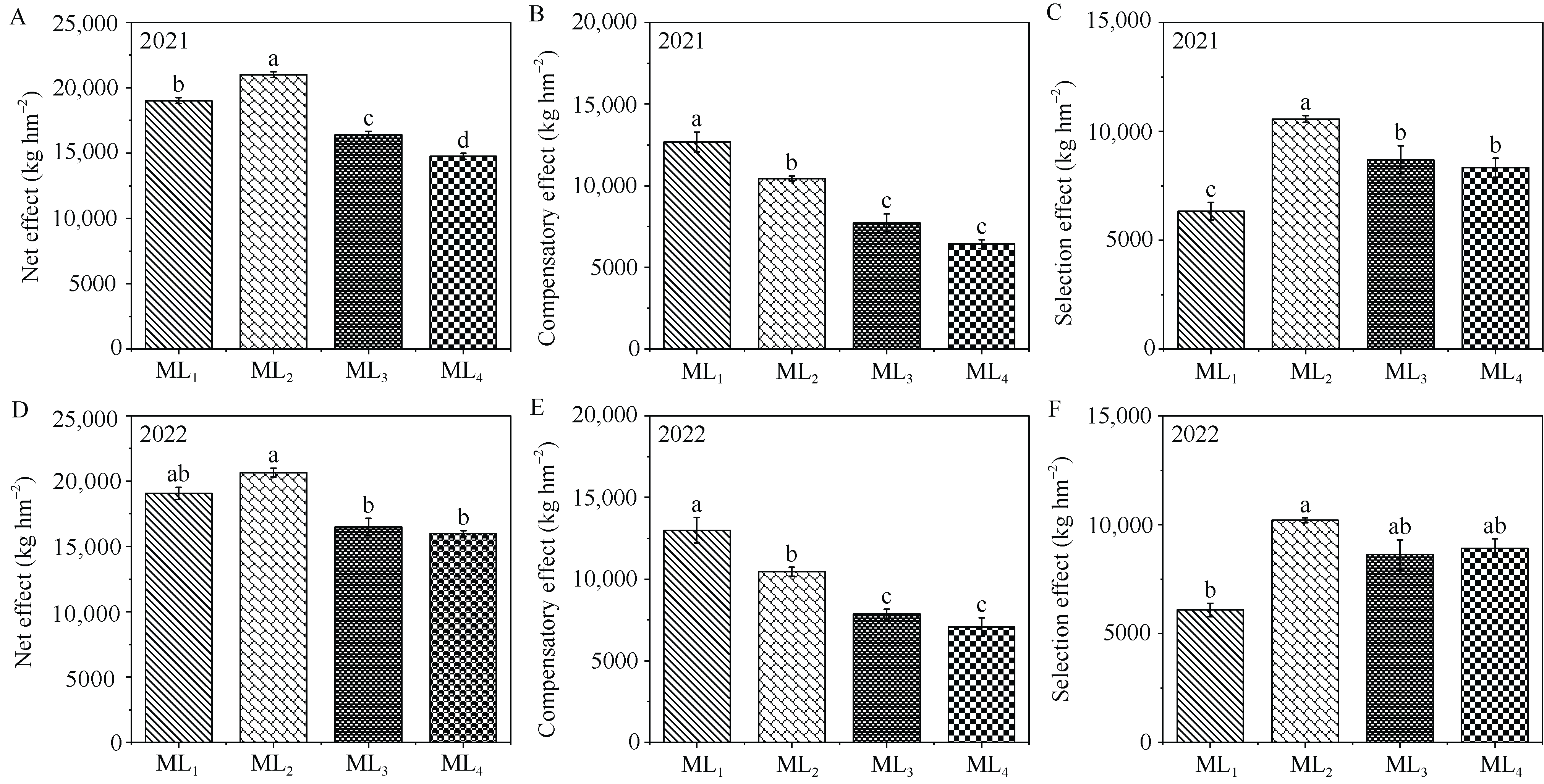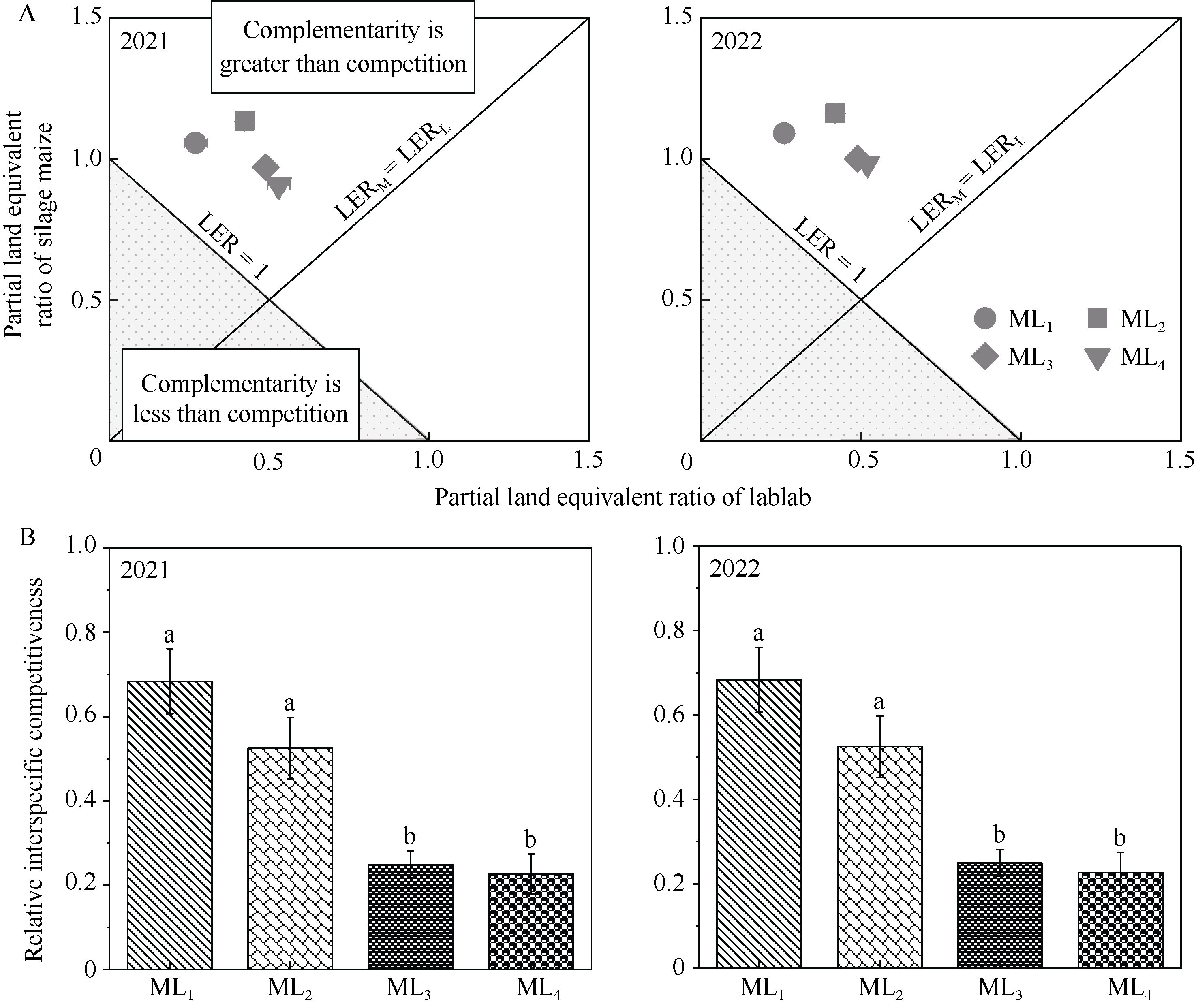 合理的豆‖禾间作种植模式具有明显的增产优势, 然而, 在不同生态位分离间作体系中, 补偿效应和选择效应对不同间作体系的产量优势影响机理仍需进一步研究。本试验于2021—2022年以青贮玉米和拉巴豆为研究对象, 以单作青贮玉米(SM)、单作拉巴豆(SL)为对照, 设置青贮玉米与每穴1粒拉巴豆间作(ML1)、青贮玉米与每穴2粒拉巴豆间作(ML2)、青贮玉米与每穴3粒拉巴豆间作(ML3)、青贮玉米与每穴4粒拉巴豆间作(ML4) 4个处理。研究分析了不同间作模式下饲草生产力、土地当量比(land equivalent ratio, LER)、增产率、相对种间竞争力(relative interspecific competitiveness, RC)和净效应(net effect, NE), 以明确补偿效应(complementarity effect, CE) 和选择效应(selection effect, SE)在间作体系产量优势发挥中的角色。结果表明, 青贮玉米与拉巴豆间作促进了系统饲草产量的形成, 系统生产力均高于单作, 其中ML2处理的总干草产量(35.19 t hm-2)和粗蛋白产量(3.24 t hm-2)达到最高, 较SM分别提高了28.48%和64.64%。所有间作模式的LER均大于1, 且LER与补偿效应呈显著正相关, 与选择效应呈显著负相关; 同时青贮玉米增产率与补偿效应呈显著正相关(P < 0.001), 与选择效应呈显著负相关。此外, 拉巴豆播种比例较低的2个处理(ML1和ML2)主要通过补偿效应提升系统生产力, 而ML3和ML4处理的增产则主要依赖于选择效应。因此, 间作系统中的产量优势随拉巴豆播种比例的增加由补偿效应主导逐渐转变为选择效应主导。