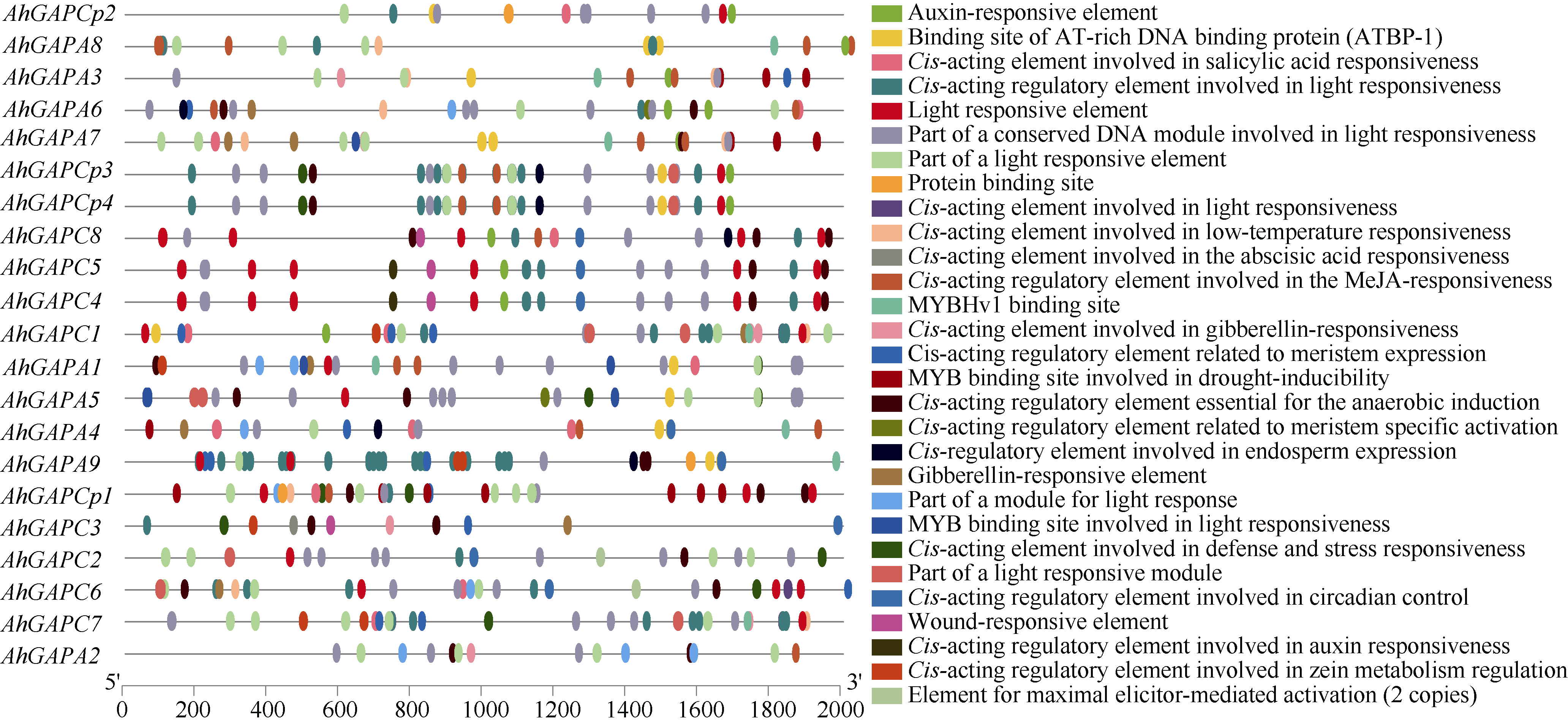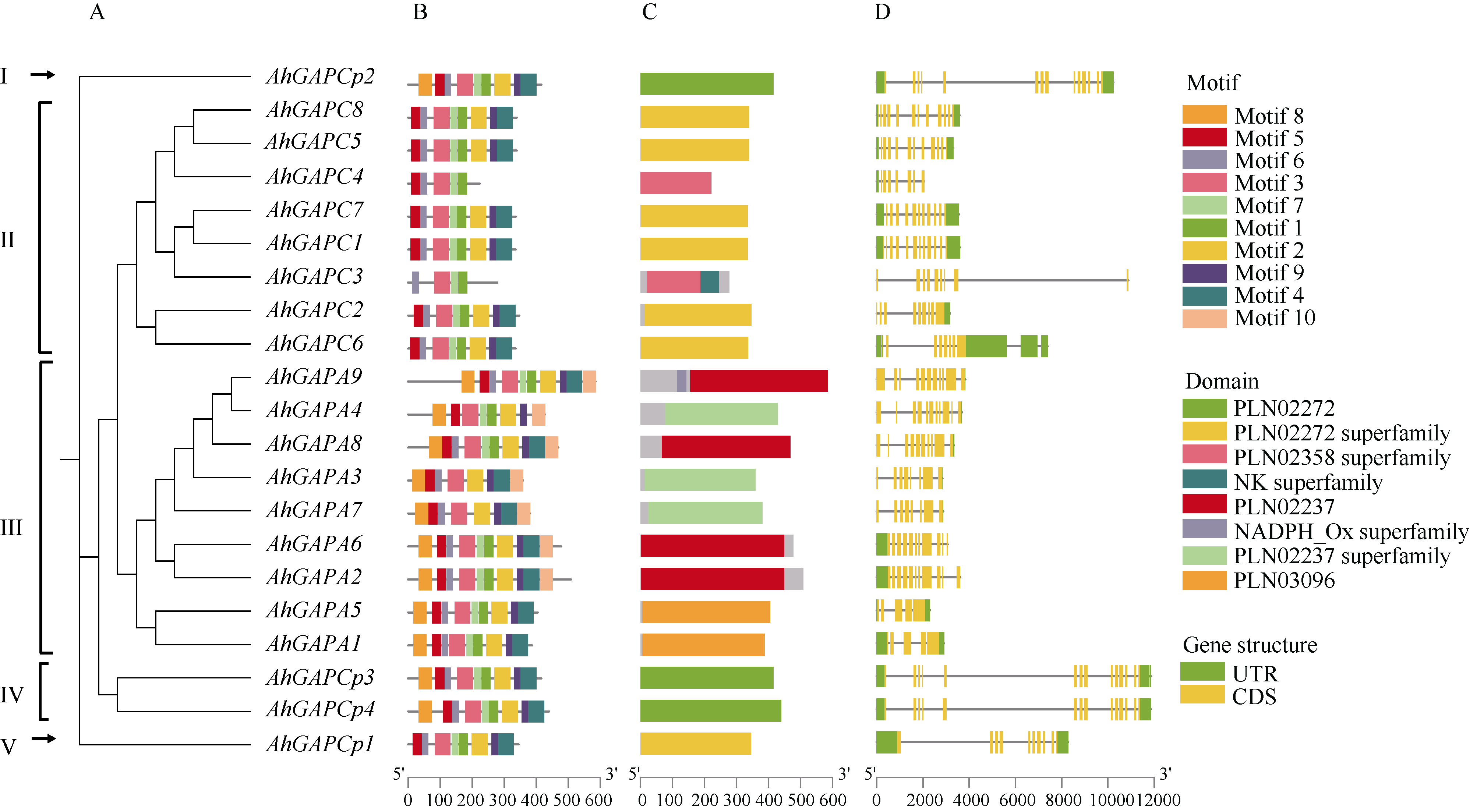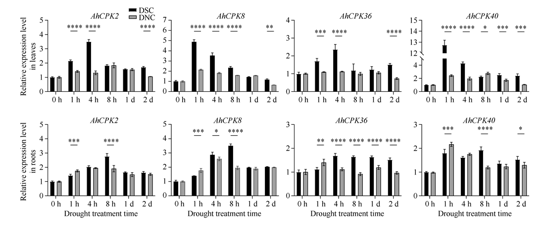 花生(Arachis hypogaea L.)是重要的油料和经济作物, 干旱是限制花生产量的主要因素之一。探明花生响应干旱胁迫的关键基因, 对后续花生品种改良, 提高产量具有重要意义。本研究以花生品种花育22号(HY22)为研究对象, 足钙(SC)、缺钙(NC) 2种营养液水培培养, 终浓度为20% PEG-6000溶液模拟干旱胁迫处理(DSC、DNC)。通过干旱处理后转录组数据结合花生钙传感蛋白编码基因CPKs的差异表达筛选出花生抗旱基因AhCPK8。以干旱处理后的花生叶片为材料, 利用酵母双杂交筛选到其互作蛋白甘油醛-3-磷酸脱氢酶(GAPDH)并得到初步验证。GAPDH家族基因在调节植物对非生物胁迫的反应中发挥着重要作用。基于AhGAPDH基因家族的生物信息学分析, 在花生中共鉴定出21个GAPDH基因, 再根据大豆和拟南芥系统发育树关系以及基因在12条染色体上的先后顺序进行命名。基本理化特征结果表明, AhGAPDH家族成员大多数为稳定、疏水性蛋白; 同一聚类的AhGAPDH家族成员大多数表现出相似的motif结构、保守结构域和基因结构; 启动子区域中有丰富的光响应、植物激素响应及非生物胁迫响应相关的顺式作用元件。AhCPK8与AhGAPDH存在相互作用, 共同调控花生的抗旱性。
