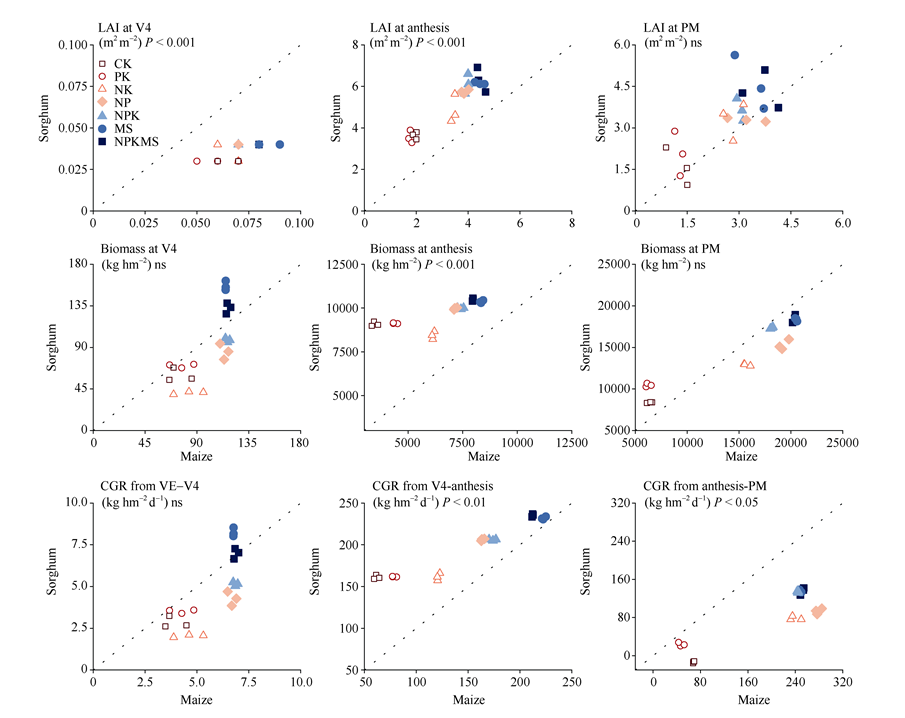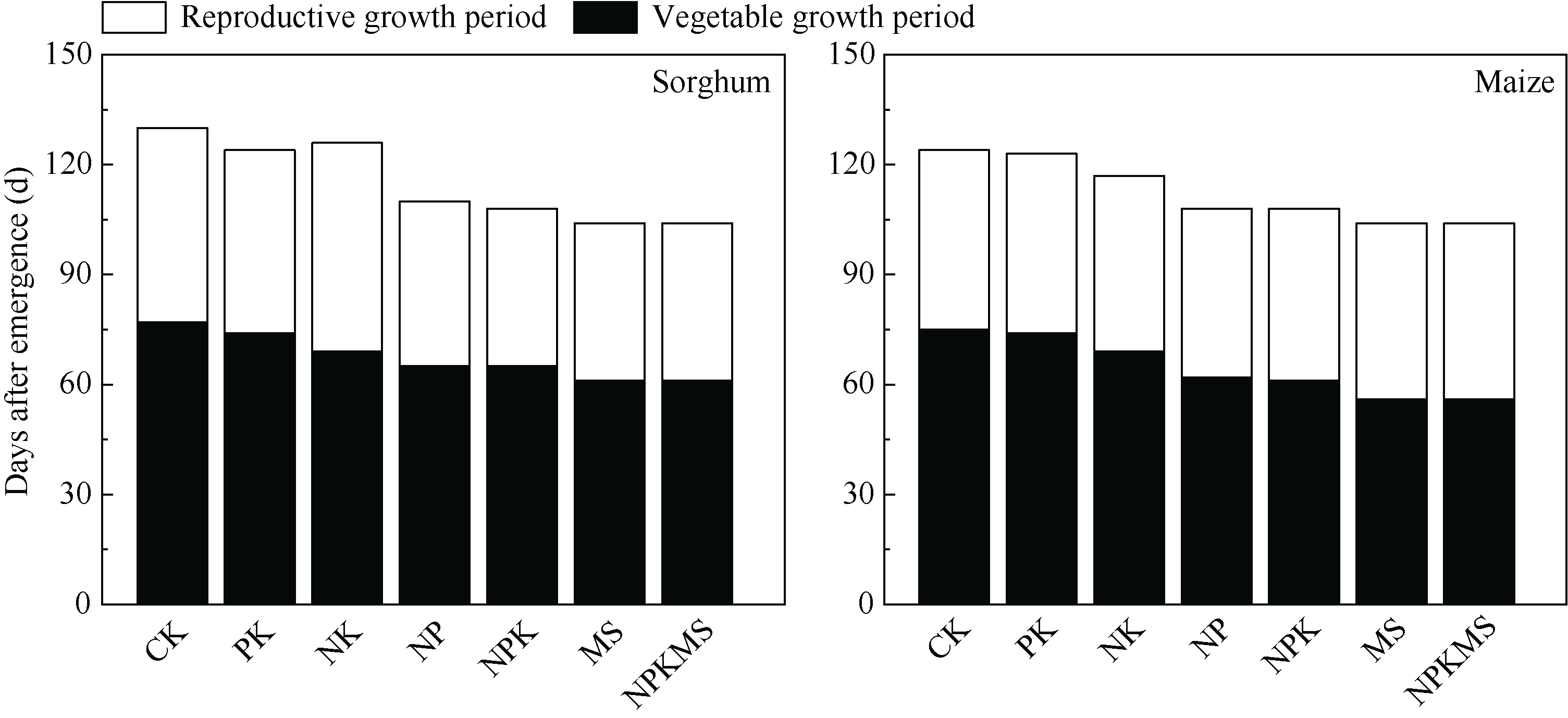 基于长期定位试验, 比较高粱和玉米2种作物耐瘠性和对不同土壤肥力的响应, 为同一区域瘠薄土壤种植高粱替代玉米提供理论支撑。长期不同施肥定位试验始于2011年, 共设CK (不施肥)、PK (缺氮)、NK (缺磷)、NP (缺钾)、NPK (氮磷钾肥)、MS (秸秆还田配施有机肥)和NPKMS (氮磷钾肥秸秆还田配施肥有机肥) 7个处理并形成了不同的土壤肥力, 比较研究高粱和玉米产量及其构成、生长发育及养分吸收对土壤肥力响应的差异。结果表明, CK和PK处理的高粱产量高于玉米, 其余处理的玉米产量高于高粱。与NPKMS处理相比, CK、PK、NK和NP处理的高粱产量分别降低52.4%~57.0%、49.6%~51.0%、18.4%~40.0%和4.1%~18.0%, 玉米产量降低70.7%~73.2%、68.4%~73.1%、21.0%~44.3%和10.0%~22.4%; CK、PK和NK处理下2种作物单位面积穗数和穗粒数均显著降低, 其中, CK和PK处理降低玉米单粒重, 但增加高粱单粒重。与NPKMS处理相比, CK、PK和NK处理推迟2种作物的花期, 但对玉米的影响更为明显; 高粱四叶期前作物相对生长速率(CGR)低于玉米, 苗期氮、磷及钾吸收量也小于玉米, 但四叶期至花期高粱CGR大于玉米; 高粱花期叶面积指数(LAI)及地上部生物量、氮磷钾吸收量均高于玉米, 与玉米相比, 养分亏缺对高粱生物量和CGR影响较小。整体来看, 高粱氮、磷及钾收获指数和生理利用效率小于玉米, 但CK和PK处理下高粱氮、磷收获指数和氮、磷及钾生理效率与玉米相当, 甚至高于玉米。对土壤养分、籽粒产量及其构成和养分吸收利用的相关性分析表明, 土壤养分含量与2种作物的产量、单位面积穗数和穗粒数, 以及玉米的单粒重均呈正相关, 与高粱单粒重呈负相关。综上, 土壤养分亏缺时高粱产量、养分吸收利用能力高于玉米, 养分胁迫降低了2种作物单位面积穗数和穗粒数, 尽管也降低玉米单粒重但提高了高粱的单粒重; 延长了2种作物营养生长阶段, 但对高粱的影响小于玉米, 本研究为2种作物合理施肥及同区域因地适种提供了理论依据。