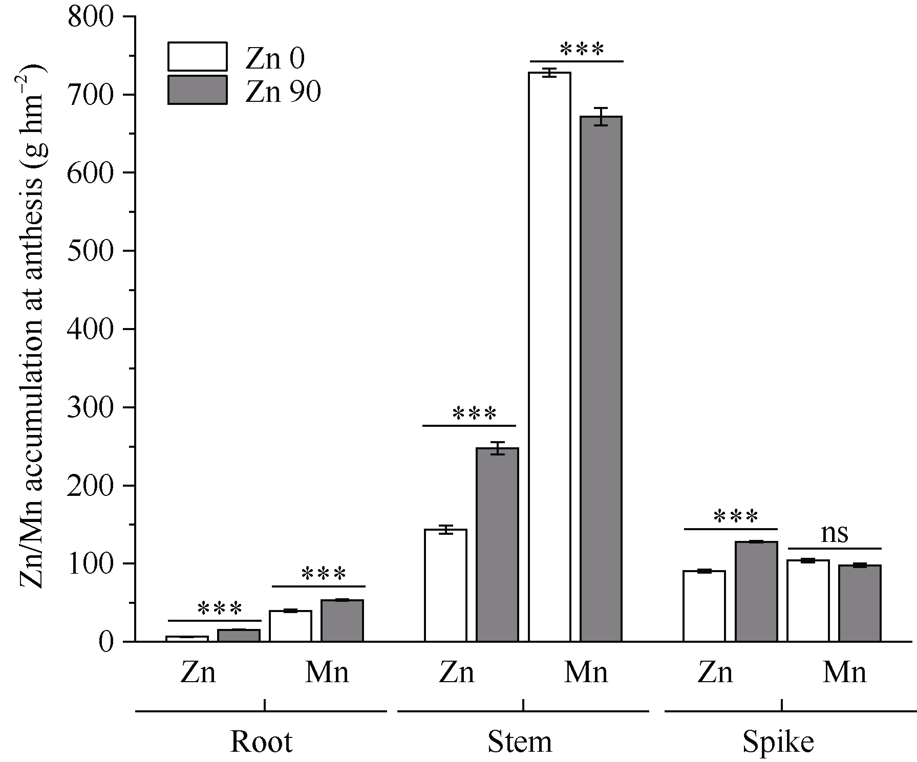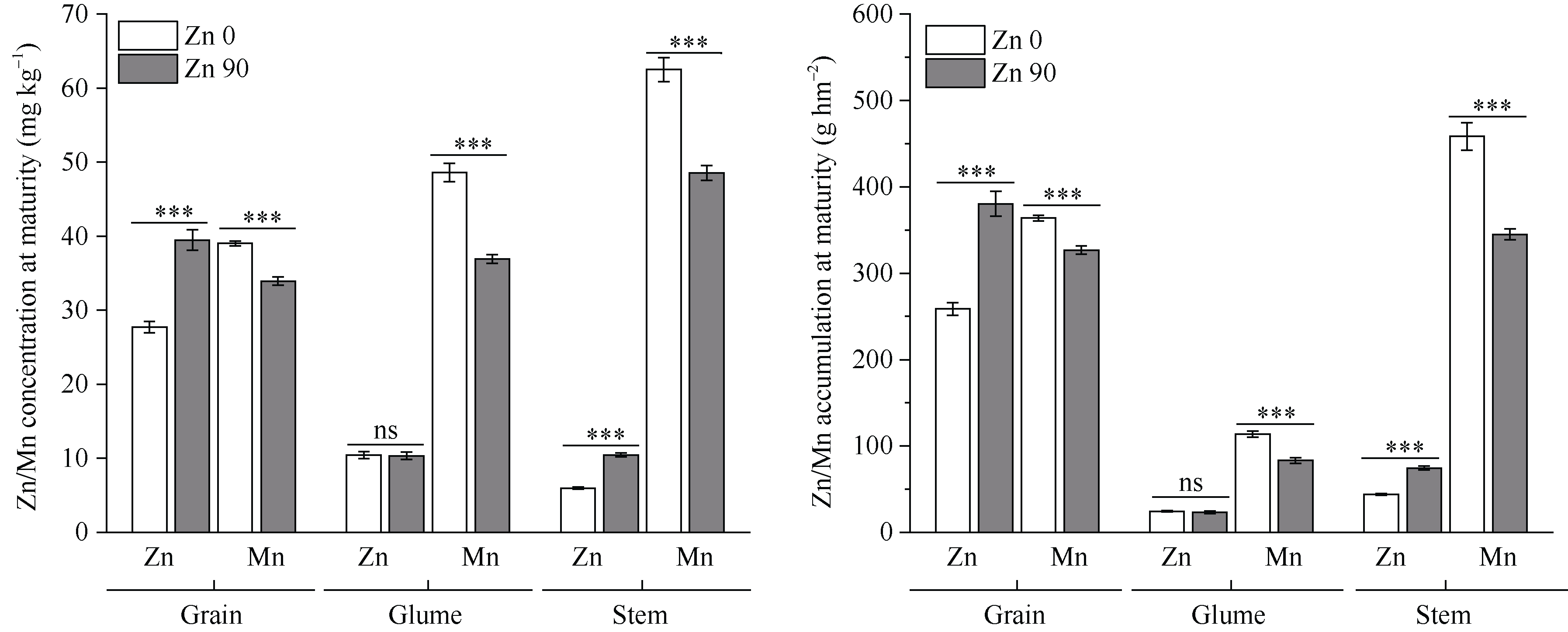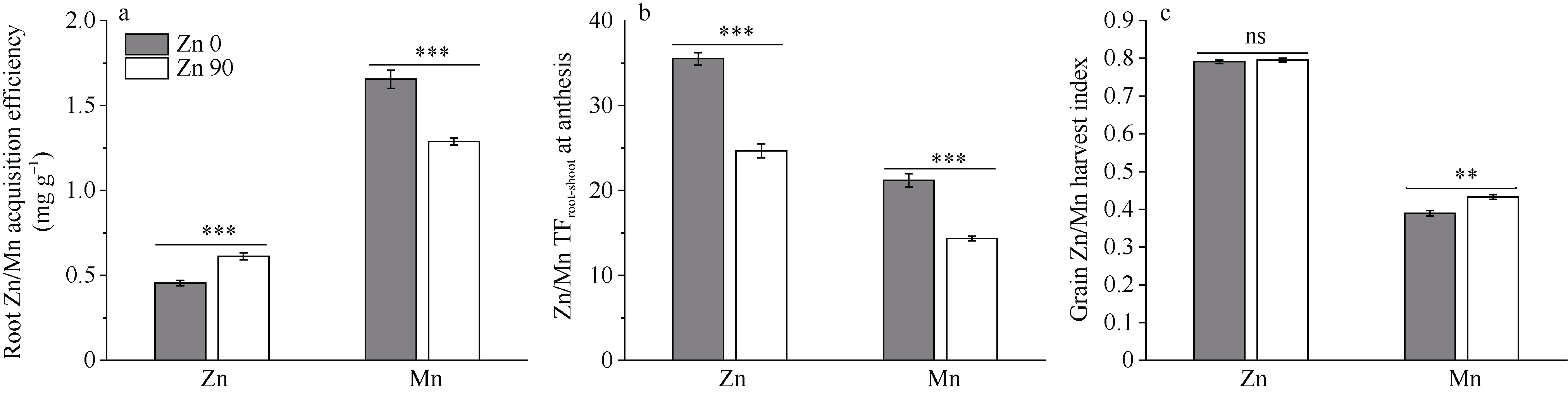 本研究旨在探究锌肥施用对小麦籽粒锌、锰含量及其吸收累积的影响, 分析锌和锰在这些过程中存在的差异, 为通过锌肥施用强化小麦锌营养、调控锰营养提供理论依据。本研究基于2017年在黄土高原旱地石灰性土壤上开始的长期定位试验, 分别在2022—2023和2023—2024年2个生长季节采集样品, 测定不同量锌肥施用条件下, 小麦开花期和成熟期各器官锌和锰的含量、累积量、根获取效率、地上部转移系数、土壤理化性质等指标, 揭示锌、锰吸收累积对锌肥施用的响应差异。结果表明, 与不施锌相比, 锌肥处理下土壤有效锌含量显著增加, 小麦成熟期籽粒锌含量提高42.4%, 地上部锌的总累积量增加46.3%; 开花期各部位锌累积量增加41.7%~131.8%, 根系锌获取效率提升34.6%, 但根-地上部锌转移系数降低30.5%, 籽粒锌收获指数无显著变化。同时, 与对照相比, 施加锌肥处理的小麦成熟期籽粒锰含量降低13.1%, 各器官锰累积量减少10.2%~27.0%; 开花期茎叶锰累积量降低7.7%, 根系平均锰获取效率和开花期根-地上部锰转移系数分别降低22.1%和32.2%, 但锰收获指数显著提高11.2%。结果表明, 施加锌肥可有效强化小麦锌营养, 同时间接调控锰营养, 其机制在于锌肥通过影响土壤微量元素有效锌及小麦开花期根系对锰锌的获取效率来提高锌的吸收而降低锰的吸收。研究结果为优化施肥策略、实现锰锌综合调控、协同提升小麦产量与营养品质提供一定的理论依据。