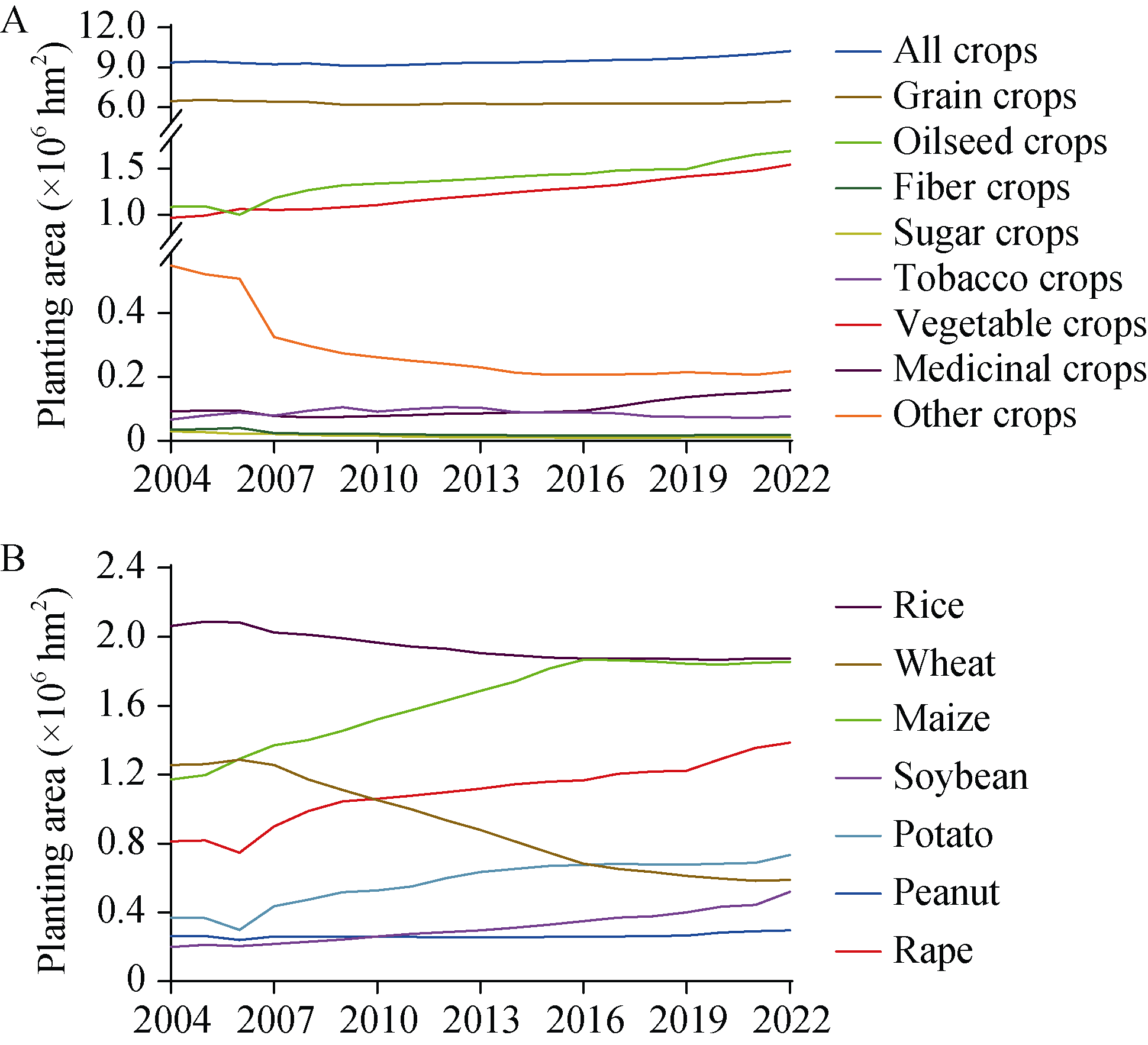 四川省农作物播种面积的历史变化 A: 2004-2022年间, 四川省各大类农作物播种面积统计。B: 2004- 2022年间, 四川省主要农作物播种面积统计。数据来源于国家统计局(https://www.stats.gov.cn/)。"