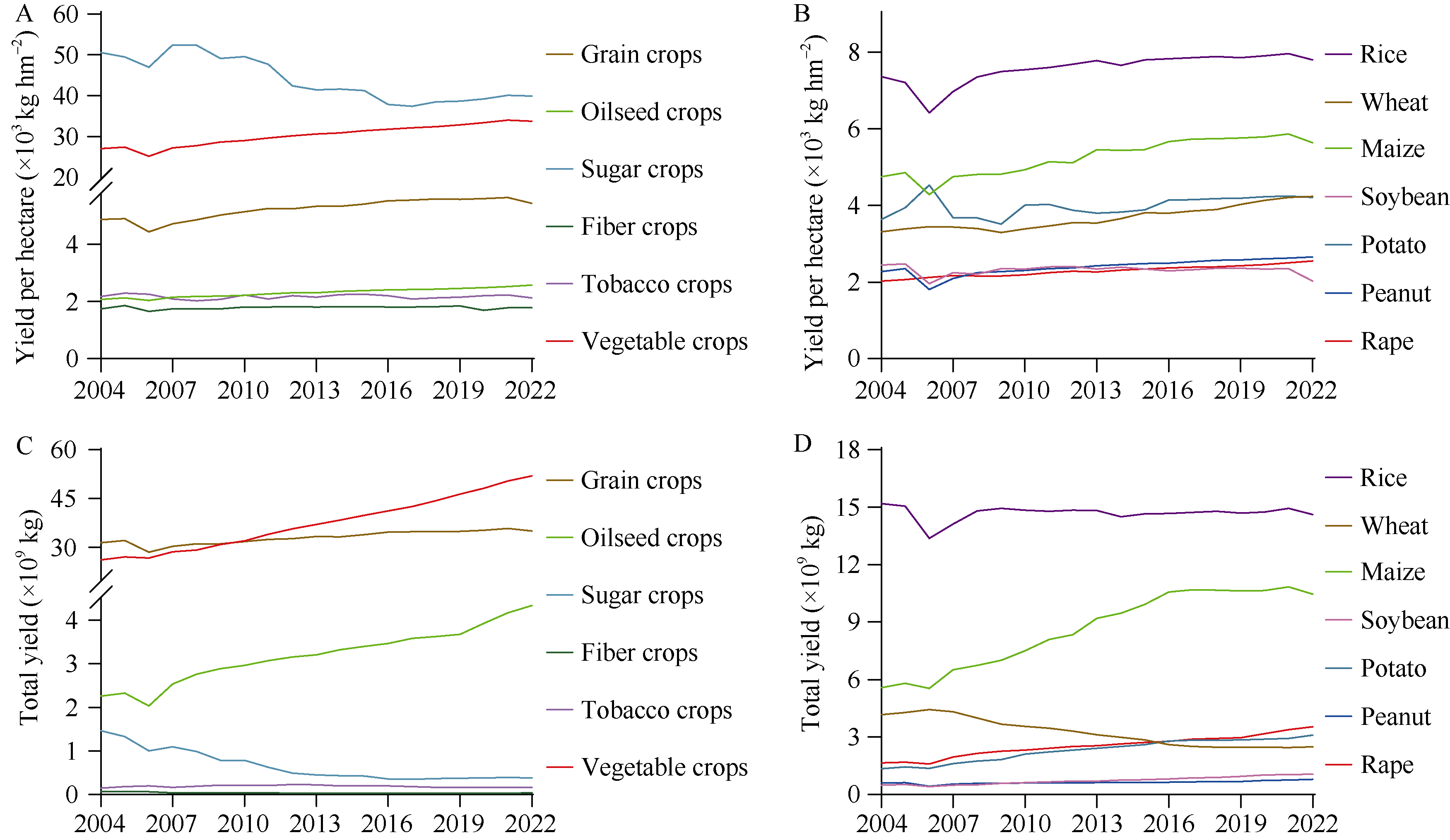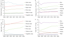 四川省农作物产量的历史变化 A, B: 2004-2022年四川省各大类农作物(A)和主要农作物(B)的单位面积产量统计。C, D: 2004-2022年四川省各大类农作物(C)和主要农作物(D)的总产量统计。数据来源于国家统计局(https://www.stats.gov.cn/)。"
