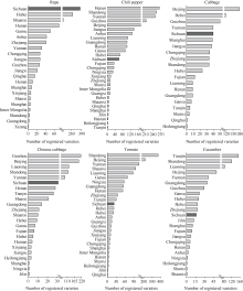 2021-2024年各省级行政区国家登记品种数量 分别统计2021-2024年全国各省级行政区国家登记的油菜、辣椒、结球甘蓝、大白菜、番茄和黄瓜的品种数量, 数据来源于中国种业大数据平台(http://202.127.42.145/bigdataNew/#)。"