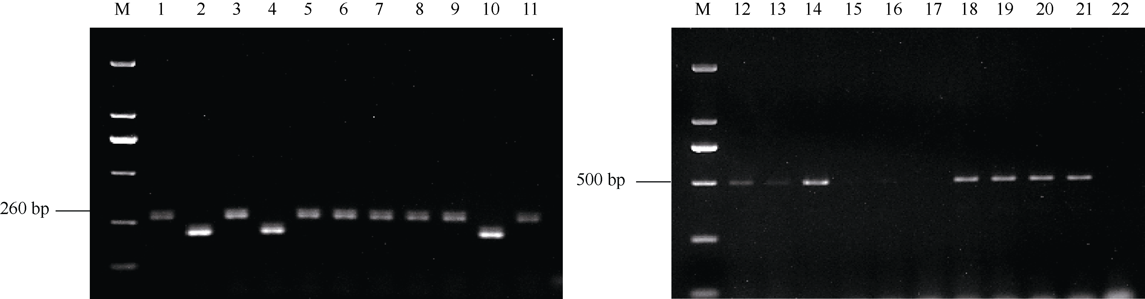 部分小麦品种(系) Yr29分子检测结果 M: marker (DL2000); 1和12: AvSYr29 NIL; 2和13: 百农64; 3和14: 鲁麦15; 4和15: 皖麦33; 5和16: Klein Flecha ; 6和17: 石家庄8号; 7和18: Fr03733; 8和19: 金禾9123; 9和20: Nidera Baguette 20; 10和21: 川麦43; 11和22: Fr03732。1~11: Yr29标记Xwmc44, 目标条带260 bp; 12~22: Yr29标记Bac17, 目标条带500 bp。"