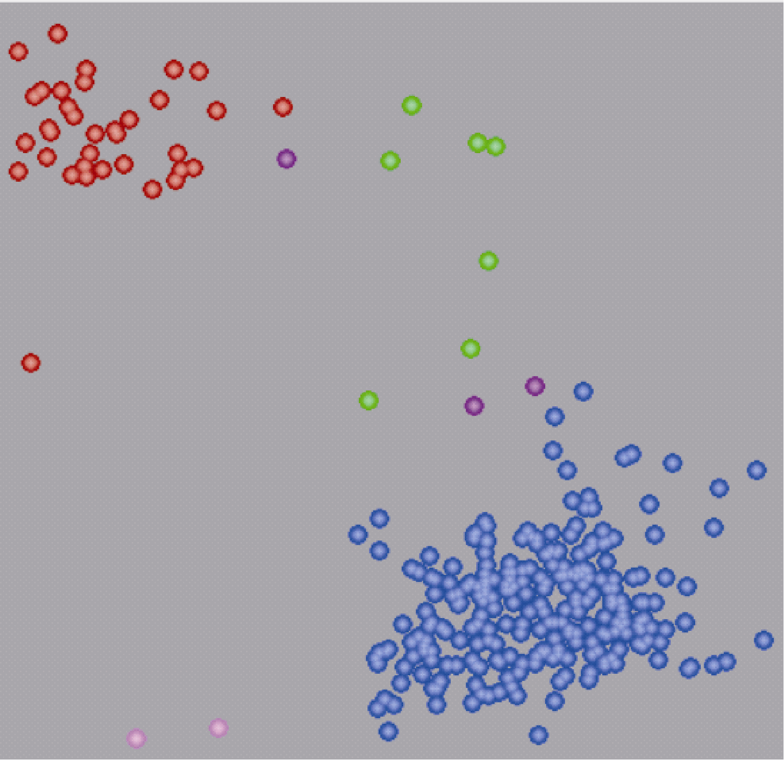 Yr86基因分型的KASP聚类图谱 红色: 携带Yr86; 蓝色: 不携带Yr86; 绿色: 杂合基因型; 粉色、紫色: 无信号"