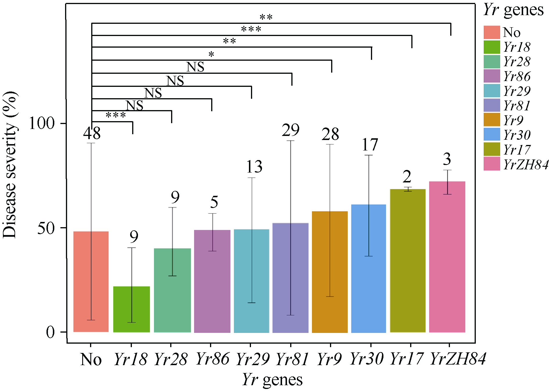 携带单个抗性基因品种(系)疾病严重度的显著相关性分析 误差棒指示各组数据的严重度最大值与最小值, 误差棒上面数值表示样本量。*: P ≤ 0.05; **: P ≤ 0.01; ***: P ≤ 0.001; NS: P > 0.05。"