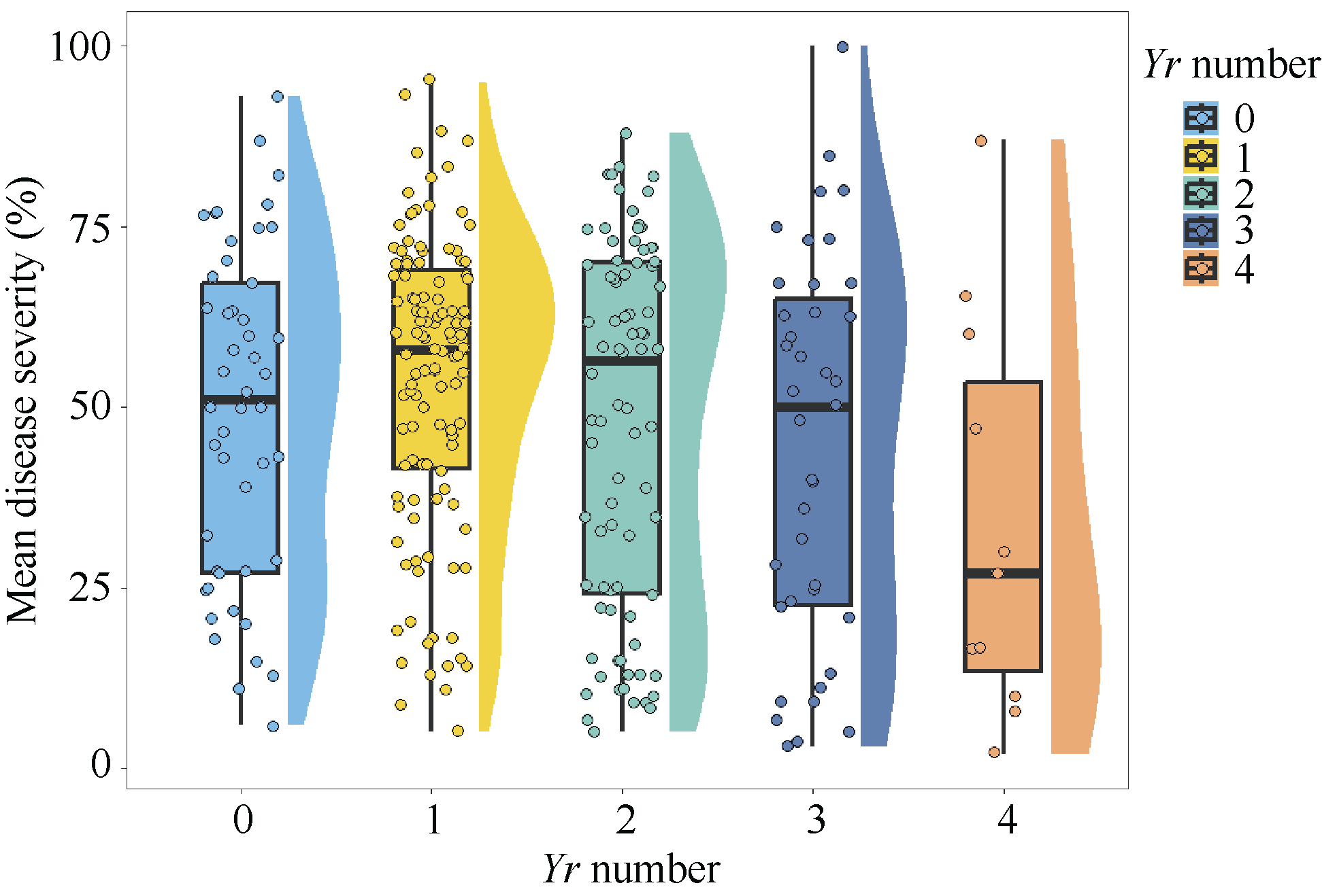 品种(系)含抗性基因个数与条锈病严重度分布"