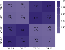 品种(系)不同环境抗病性表型DS及IT值的相关系数热图 GS-DS: 品种(系)在甘肃进行成株期抗病性鉴定的严重度; XJ-DS: 品种(系)在新疆进行成株期抗病性鉴定的严重度; GS-IT: 品种(系)在甘肃进行成株期抗病性鉴定的反应型; XJ-IT: 品种(系)在新疆进行成株期抗病性鉴定的反应型。*: P ≤ 0.05; **: P ≤ 0.01; ***: P ≤ 0.001; NS: P > 0.05。"