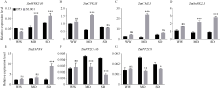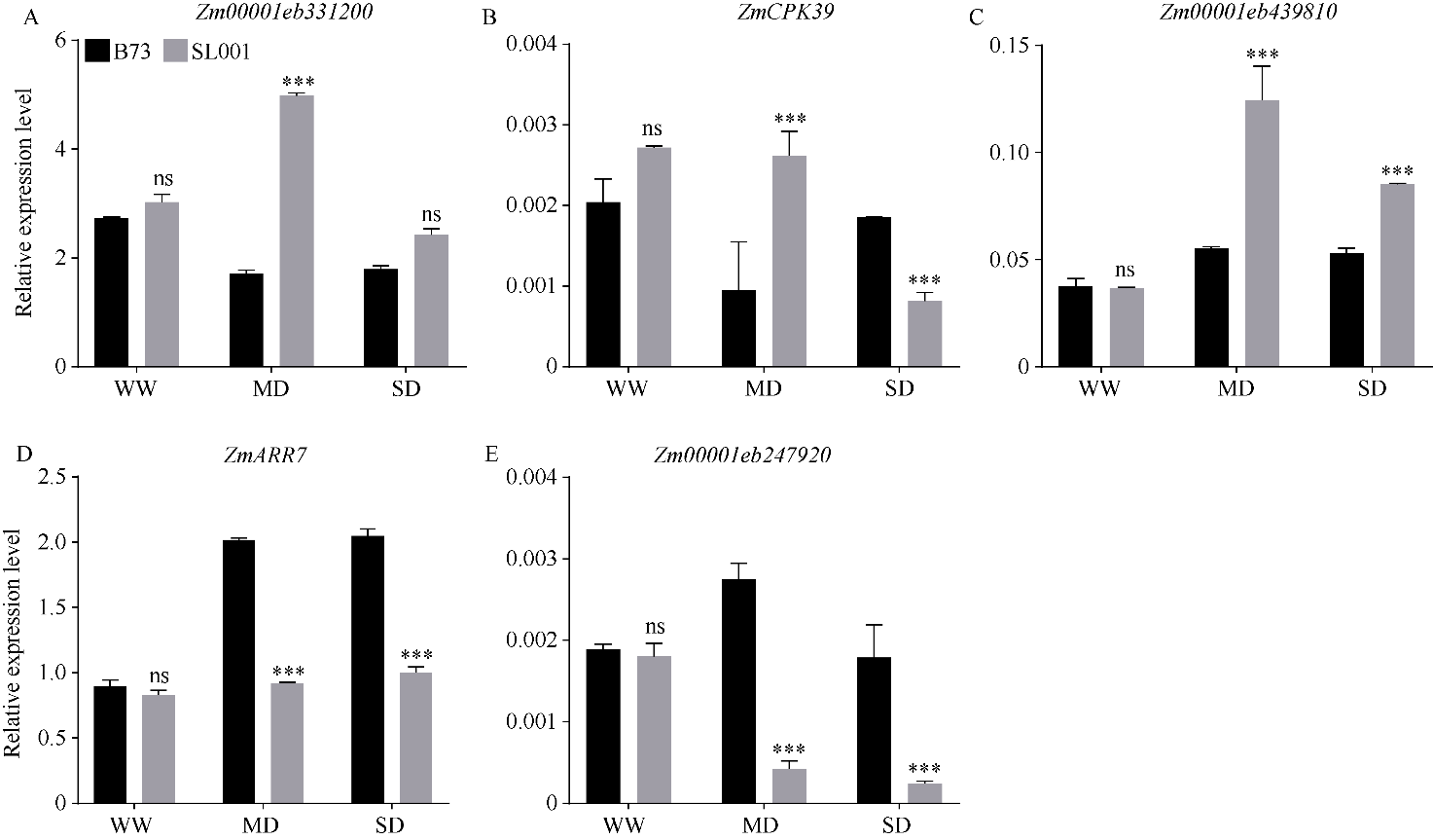 摘要: 干旱是玉米生长发育过程中影响最严重的非生物胁迫因素之一, 挖掘玉米抗旱相关基因并将其应用于培育抗旱新品种是解决该问题的有效途径。为了挖掘玉米抗旱关键基因, 本研究利用干旱敏感自交系B73及抗旱自交系SL001开展抗旱表型鉴定, 发现干旱胁迫后SL001较B73的萎蔫程度更小, 复水后的存活率显著高于B73, 且干旱胁迫后SL001相对含水量和净光合速率等表型性状均显著高于B73。通过对B73和SL001不同干旱胁迫条件下的转录组数据分析, 共鉴定出11,240个差异表达基因, 其中4354个基因在中度干旱胁迫和重度干旱胁迫处理时差异表达, 且不在正常水分处理时差异表达。这些基因主要富集于植物激素信号转导途径和植物-病原体互作途径。在这些基因中预测了2个玉米抗旱候选基因Zm00001eb439810、Zm00001eb365420, 并进行了qRT-PCR验证, 结果表明作为抗旱候选基因Zm00001eb439810可能正向调控玉米对干旱胁迫的响应, 而Zm00001eb365420可能负向调控玉米对干旱胁迫的响应。本研究为玉米抗旱提供了重要材料和基因资源。