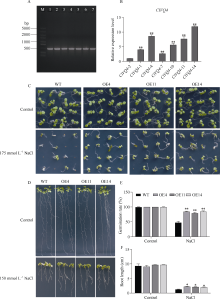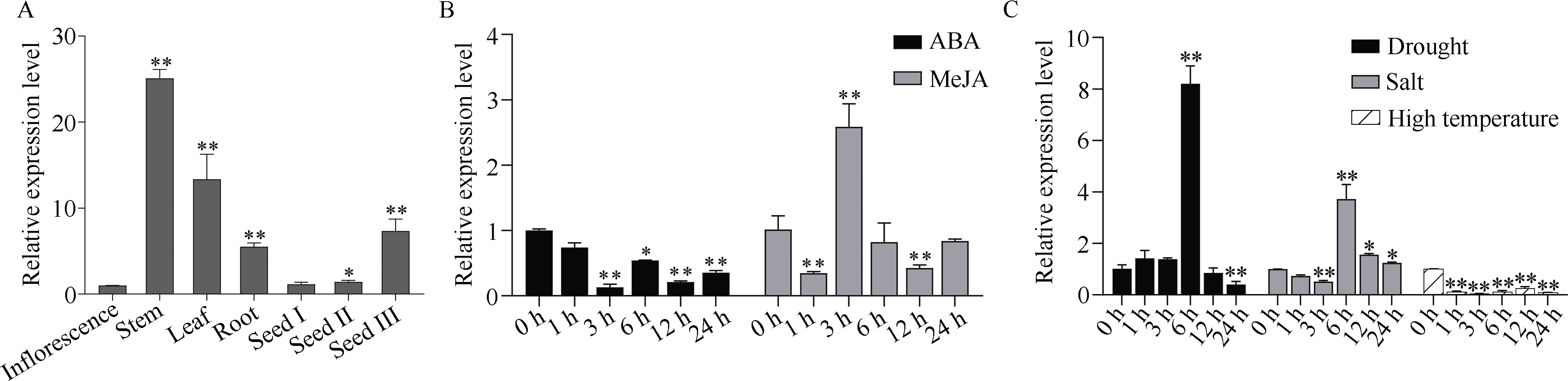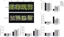 摘要: VQ蛋白是一类含有“VQ”保守结构域的植物特异性蛋白家族, 因在非生物胁迫响应和生长发育中发挥重要作用备受关注。本研究以“皖薏2号”为材料, 利用生物信息学分析手段、荧光定量PCR技术、亚细胞定位、酵母双杂试验等对薏苡VQ4进行分子特征鉴定; 通过酵母异源表达和过表达拟南芥验证其对盐胁迫的响应。结果表明, ClVQ4的开放阅读框长度为594 bp, 编码197个氨基酸, 并且ClVQ4是等电点为6.43的不稳定亲水性蛋白。顺式作用元件分析结果发现, ClVQ4基因启动子序列含有多个激素响应元件和逆境胁迫响应元件。ClVQ4基因的表达受到茉莉酸甲酯(MeJA)和脱落酸(ABA)的诱导, 其表达量在盐胁迫下显著上调。亚细胞定位和酵母双杂结果表明, ClVQ4蛋白主要定位于细胞核和细胞膜中, 并且可以和薏苡WRKY30相互作用, 同时可以和其他VQ蛋白相互作用形成异源二聚体。在NaCl处理下, 酿酒酵母异源表达ClVQ4基因可以提高酵母的存活率。在盐胁迫下, ClVQ4过表达拟南芥的萌发率和根长均显著高于野生型, 且各转基因株系中POD、SOD和CAT活性均显著高于野生型, 而MDA含量显著低于野生型。