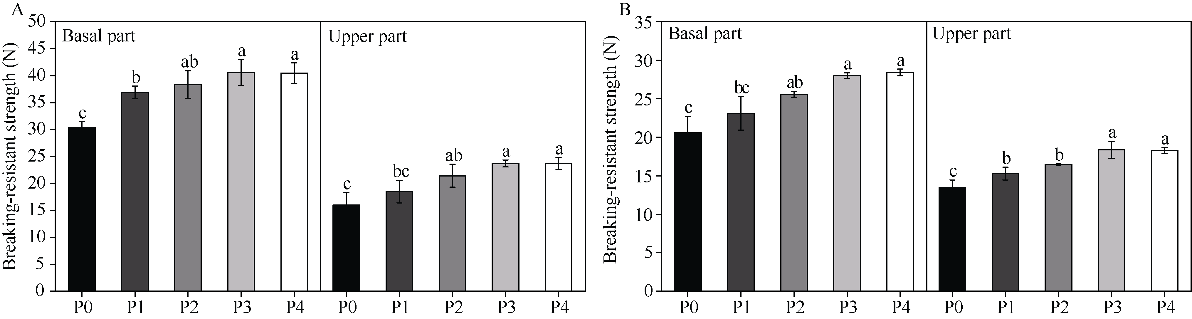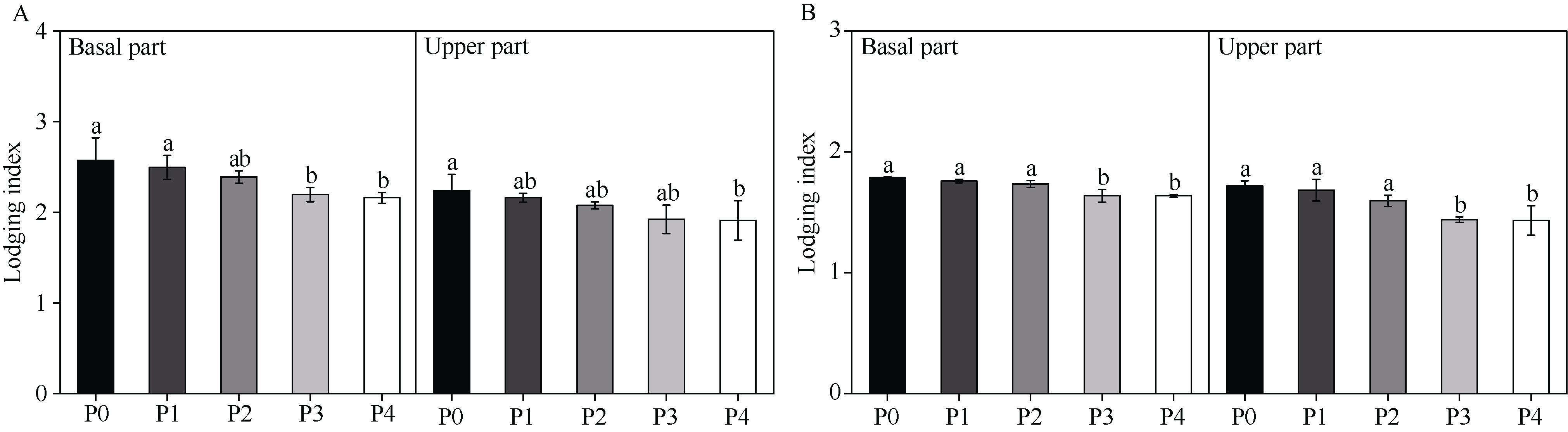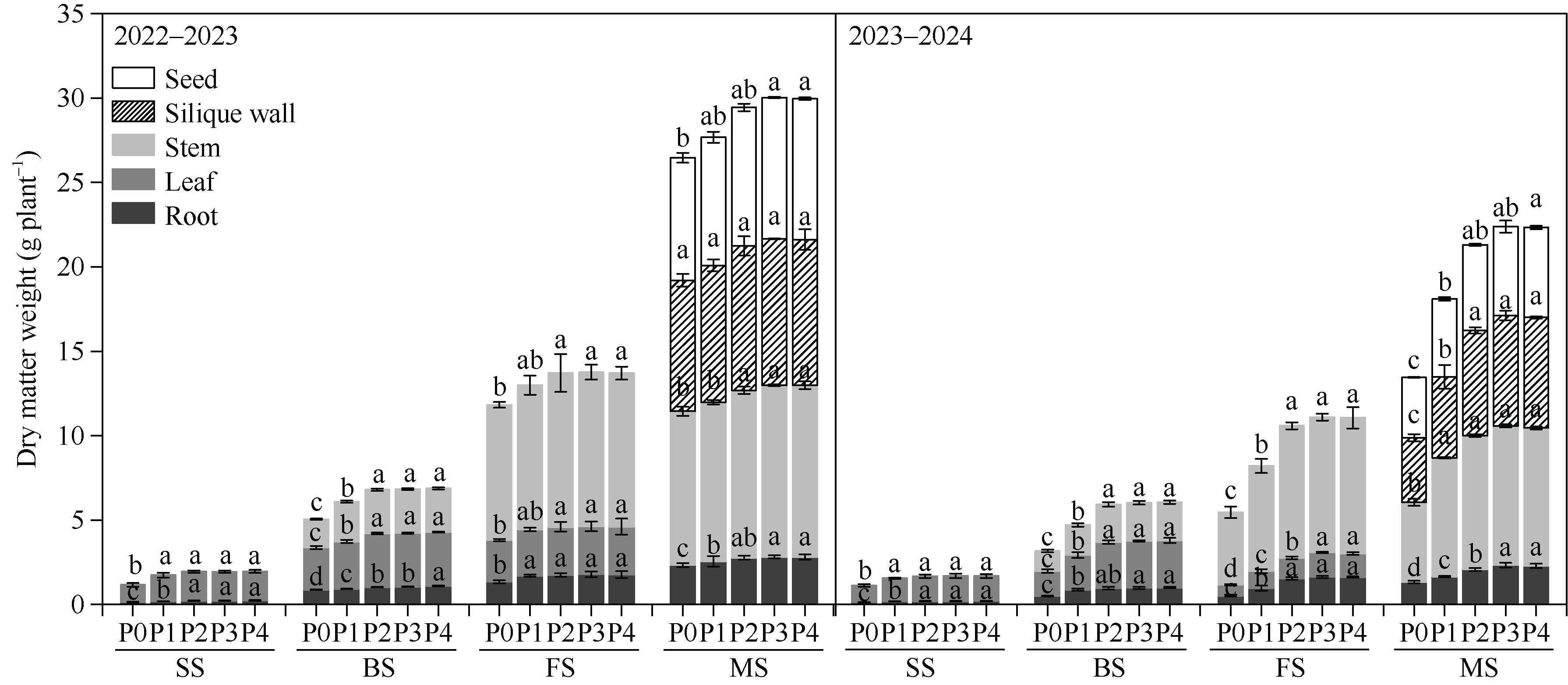 摘要: 为明确磷肥用量对迟播油菜产量形成及磷肥利用效率的影响, 本试验以品种华油杂137为材料, 连续2年在武汉进行磷肥用量单因素试验。结果表明: 施用磷肥显著增加迟播油菜产量, 单株角果数是迟播油菜产量的主要影响因子(P < 0.05)。2年试验结果中产量分别比对照P0处理提高了16.83%~24.63%和22.99%~34.68%, 单株角果数分别比P0处理提高了14.51%~37.46%和26.35%~53.83%。油菜株高、根颈粗、角果层厚度、有效分枝高度、分枝数、磷含量、磷积累量、干物重及抗倒伏能力均呈现先增加后稳定的趋势, 在P3 (120 kg hm-2)、P4 (150 kg hm-2)处理时无显著差异。随着磷肥用量的增加, 磷肥利用率呈现先增后减的趋势, 在P2 (90 kg hm-2)处理达到最大; 磷肥偏生产力随磷肥用量增加而下降; 磷肥农学利用率在P2、P3处理下达到最佳; 磷肥贡献率在P3和P4处理下达到最佳。综上所述, 施磷提高了迟播油菜的产量、干物质重、抗倒伏能力和磷肥利用效率, 但继续增加磷肥用量时, 磷肥的利用效率降低, 同时对产量、干物质重及抗倒伏能力无显著影响。因此, 在保证油菜稳产、抗倒的前提下, 磷肥用量在P3水平时利于提高迟播油菜产量、抗倒伏能力和磷肥利用效率。