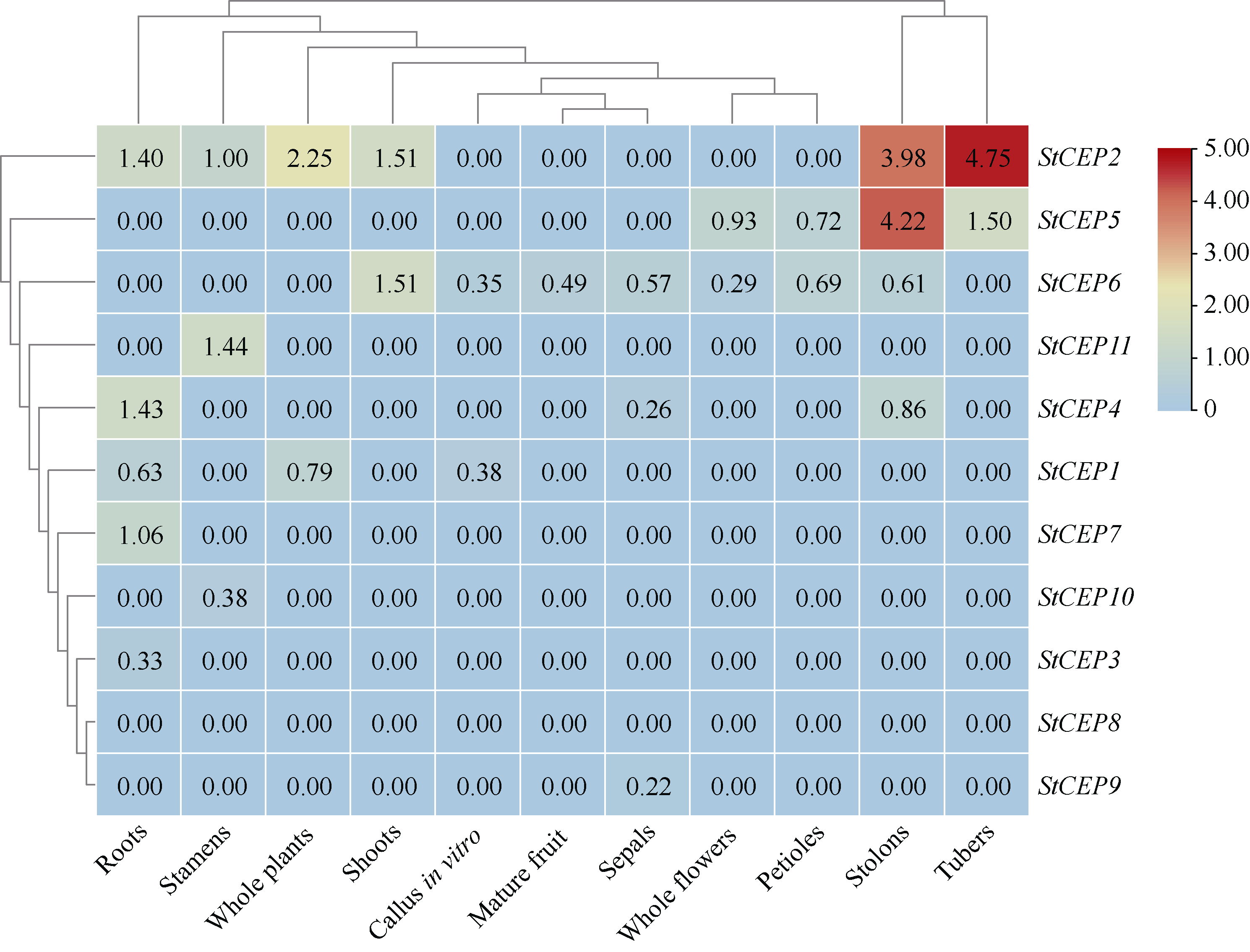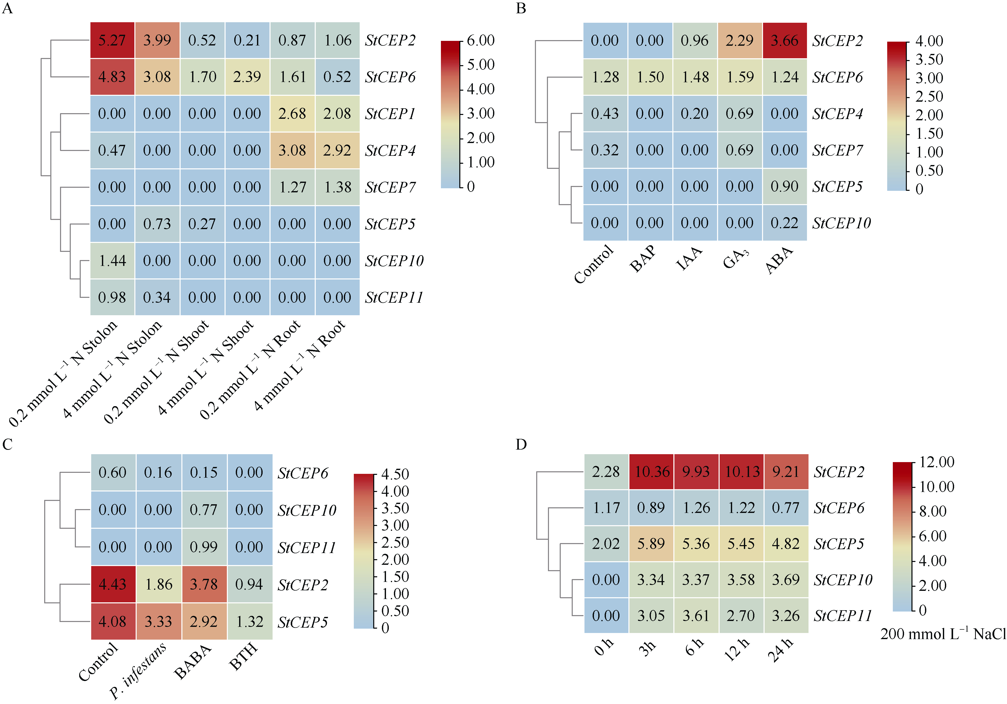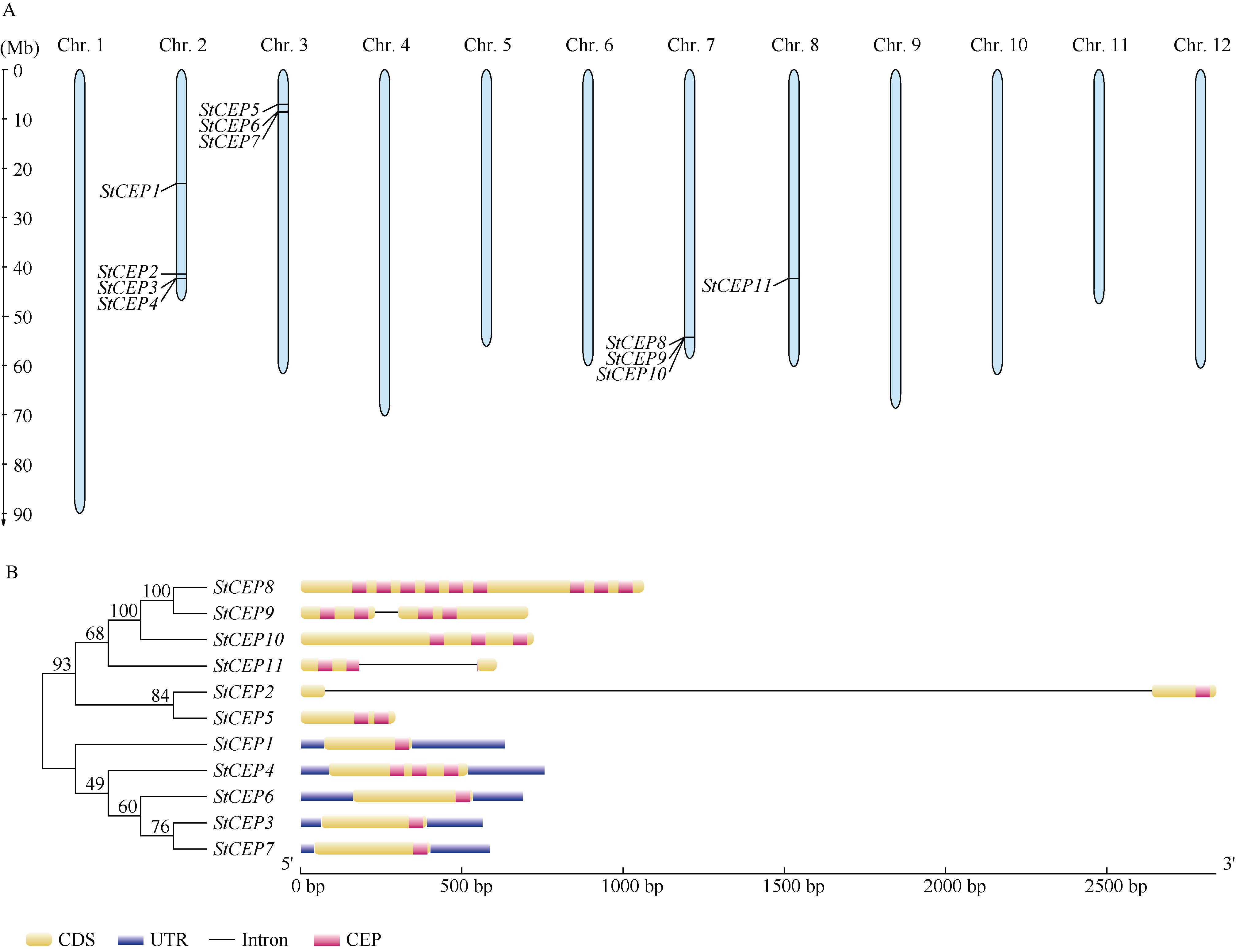 摘要: CEP (C-terminally encoded peptide)编码一类在C-末端附近具有保守基序的分泌小肽, 属于多成员的基因家族, 在调控植物根系生长、氮素营养及逆境胁迫中起重要作用。本研究对马铃薯(Solanum tuberosum) CEP基因(StCEP)家族成员进行了鉴定, 并对StCEP家族成员的理化特征、保守基序、系统进化关系和启动子顺式作用元件进行了分析; 利用RNA-seq数据分析了StCEP家族成员在马铃薯不同组织以及响应不同环境信号的表达模式, 并筛选受盐胁迫显著诱导的StCEP基因; 最后利用外源施加合成StCEP小肽的方法对StCEP小肽的耐盐性功能进行了验证。结果表明, 在马铃薯基因组中共鉴定到11个StCEP家族成员, 分布在4条不同的染色体上, 其编码的蛋白含有1~9个数目不等的CEP基序; StCEP家族成员与拟南芥、番茄CEP成员相互嵌合形成2个大的分支, 各分支分别包含21个和26个CEP成员; 马铃薯与拟南芥之间仅存在1对CEP基因共线性关系, 而与亲缘关系较近的番茄之间存在12对CEP基因共线性关系; StCEP基因的启动子区域主要包括光响应、激素响应、植物生长发育响应和逆境胁迫响应的顺式作用元件; StCEP基因的表达具有明显的组织特异性且受氮素、激素(BAP、IAA、GA3和ABA)、不同生物(致病疫霉、BABA和BTH)与非生物(NaCl)逆境因子的诱导; 外施StCEP2小肽可以促进马铃薯不定根的生长并增强马铃薯的耐盐性。本研究为后续深入解析StCEP基因家族成员在马铃薯生长发育与响应环境信号过程中的功能提供了参考信息。