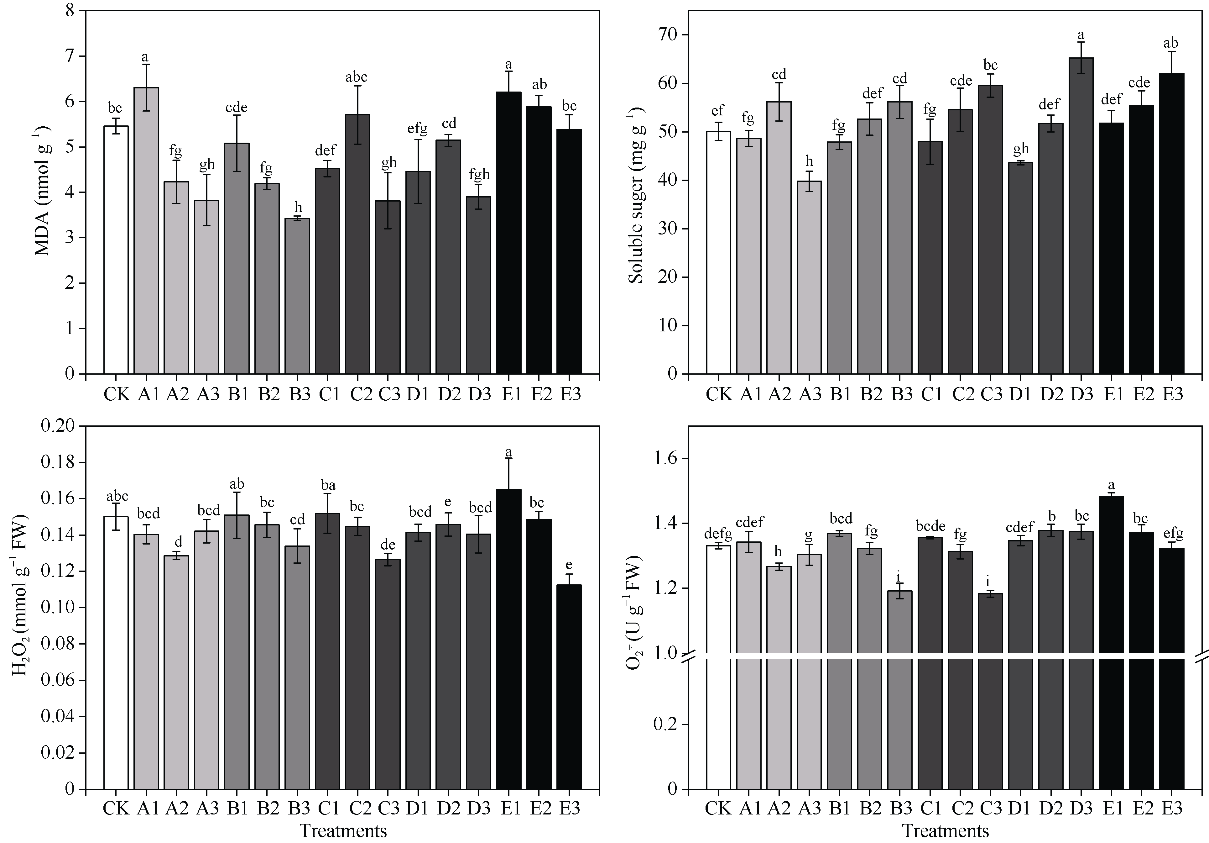 迟播油菜越冬期叶片中可溶性糖及活性氧含量存在显著差异(图5)。A2、A3、B2、B3、C1、C3、D1、D3处理后丙二醛含量与对照差异均达显著水平, B3降幅最大, 较CK降低37.3%。与CK相比, A2、B3、C3、D3、E3处理后可溶性糖含量与对照差异均达显著水平, D3增幅最大, 较CK提高30.2%, 其次为E3、C3。A2、C3、E3处理迟播油菜越冬期叶片的H2O2含量均显著降低, 较CK分别降低14.3%、15.8%、25.0%。A2、B3、C3处理叶片O2?含量均显著降低, 较CK分别降低4.8%、10.4%、11.1%。