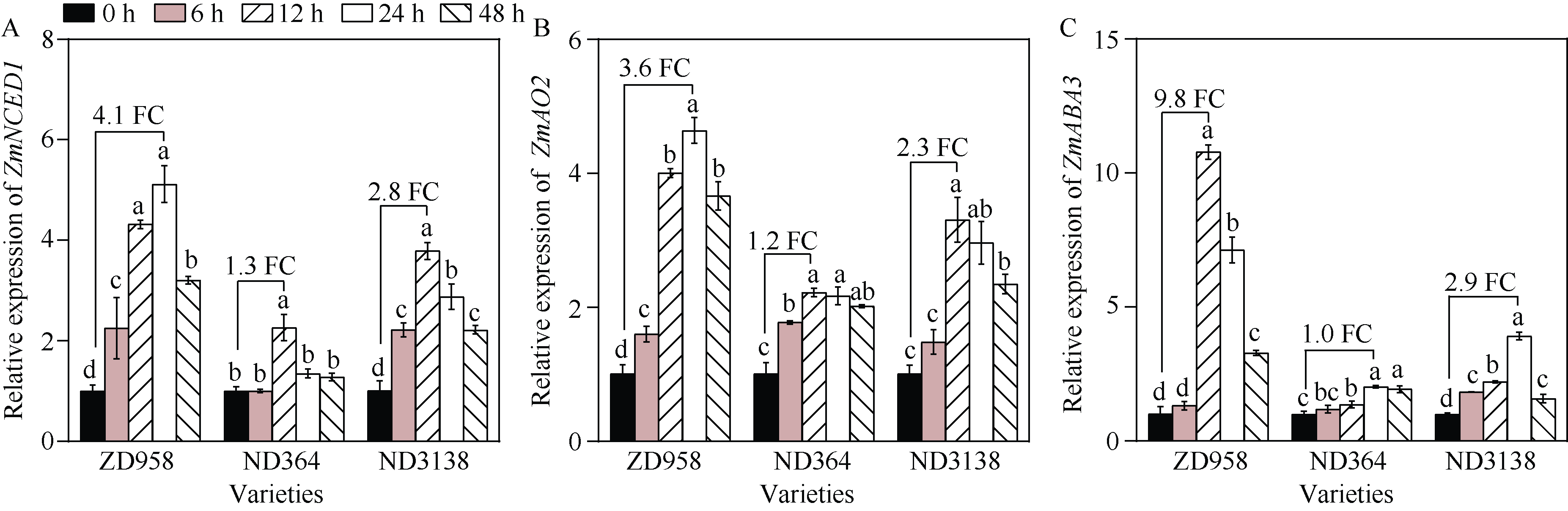 Effects of PEG stress on the gene expression of ZmNCED1, ZmAO2, and ZmABA3 in maize leaves Different lowercase letters within the same variety indicate significant differences between treatment time points (P < 0.05). Treatments and abbreviations are the same as those given in Fig. 1. FC: fold change."