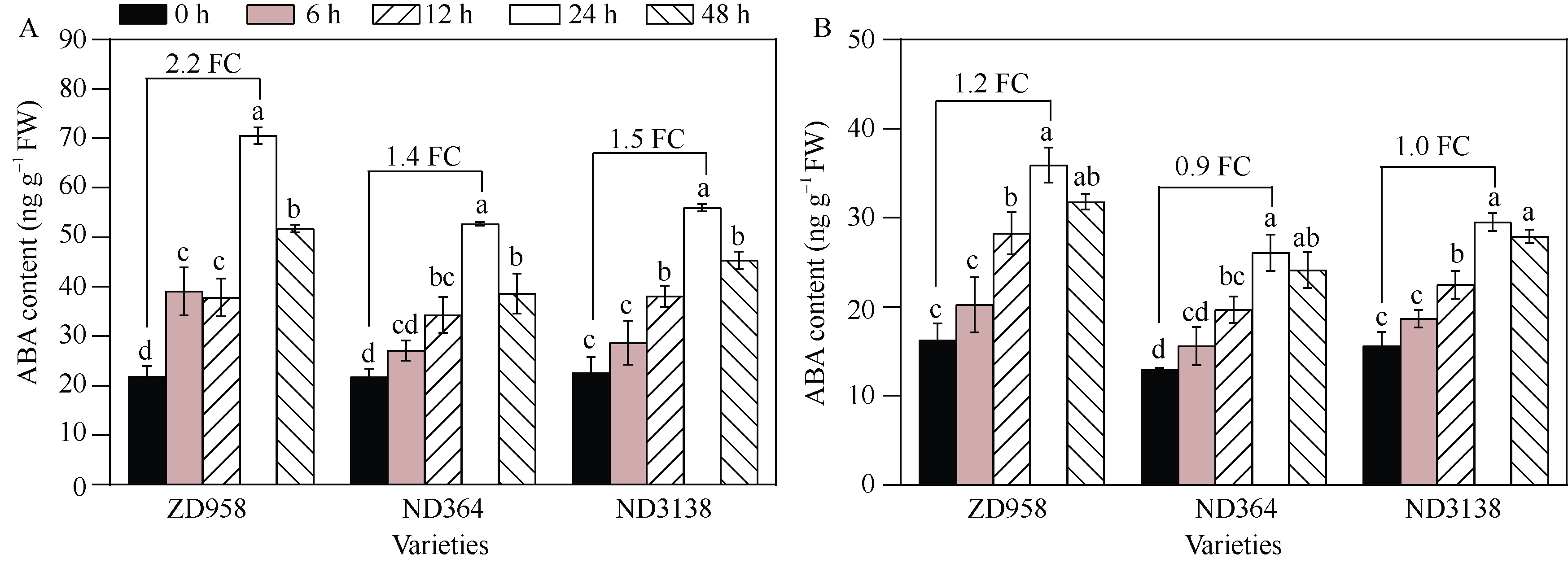 Effects of PEG on ABA content in maize leaves and roots A: ABA content in maize leaves; B: ABA content in maize roots. Different lowercase letters within the same variety indicate significant differences between treatment time points (P < 0.05). Treatments and abbreviations are the same as those given in Fig. 1. FC: fold change."