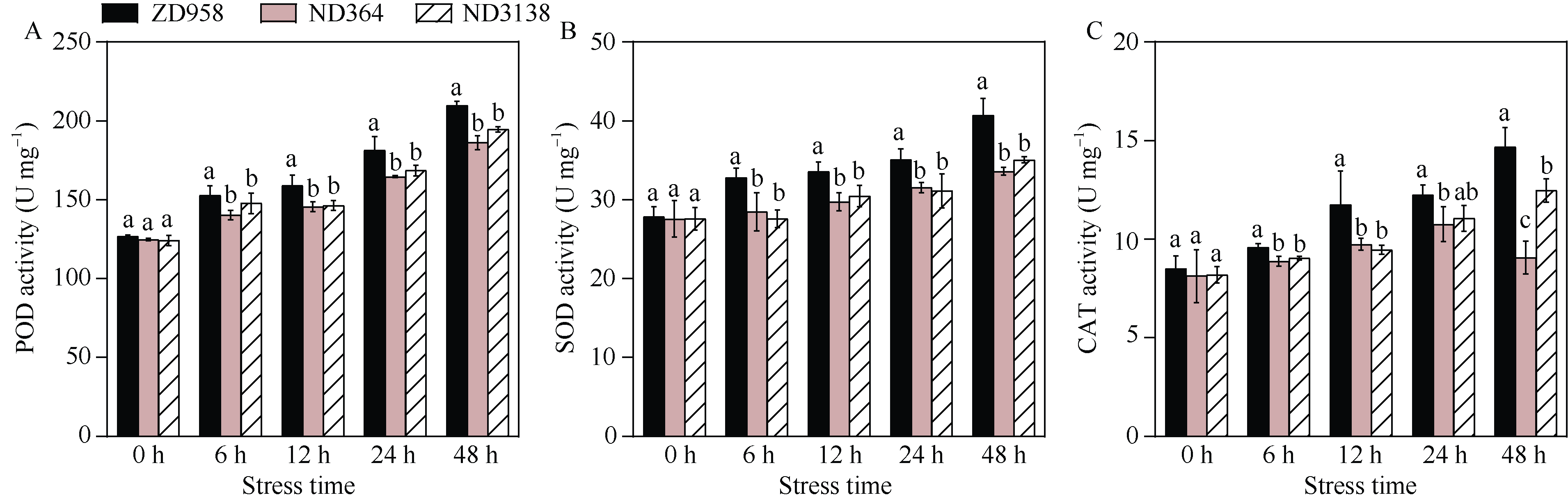 Effect of PEG on the activities of POD, SOD, and CAT in maize leaves Different lowercase letters at the same treatment time indicate significant differences between varieties (P < 0.05). Treatments and abbreviations are the same as those given in Fig. 1."