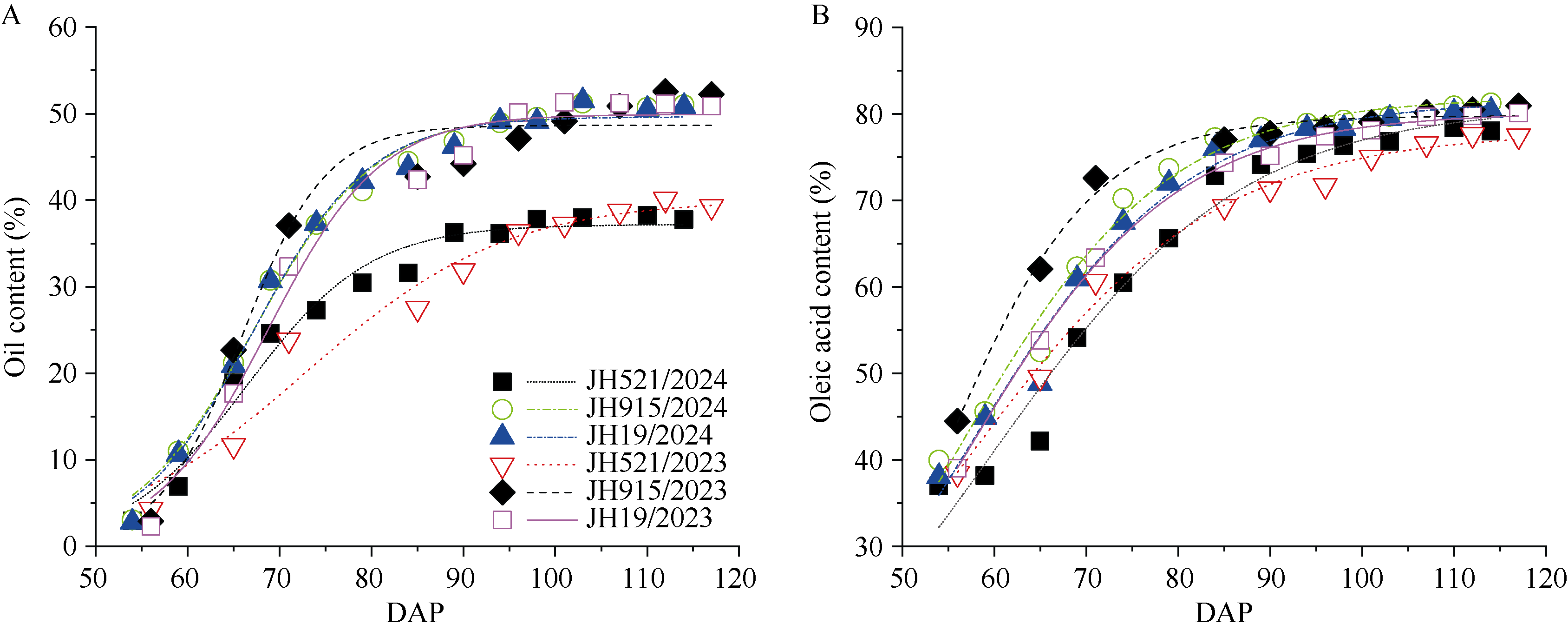 This study compared the growth dynamics, dry matter accumulation, yield components, and oil accumulation characteristics of three high-oleic-acid peanut varieties—Jihua 915, Jihua 19, and Jihua 521—during the 2023 and 2024 growing seasons. The aim was to provide a theoretical basis for understanding the mechanisms underlying high yield, high oil content, and high oleic acid levels. Results showed that yield followed the order: Jihua 915 > Jihua 19 > Jihua 521. Jihua 915 exhibited a shorter plant height (< 40 cm), an optimal peak leaf area index (about 5.6), and a well-structured above-ground canopy. After pod initiation, Jihua 915 also demonstrated significantly higher crop growth rate, net assimilation rate, pod growth rate, and pod dry matter distribution ratio (48.75%) compared to the other two varieties. Although Jihua 521 had a large leaf area index and high photosynthetic potential during the growth period, its excessively dense canopy structure resulted in a lower allocation of dry matter to pods and reduced yield. Jihua 19 showed intermediate performance across all traits. In terms of oil and oleic acid content, Jihua 915 and Jihua 19 were comparable and both superior to Jihua 521. The peak accumulation rates of oil and oleic acid in Jihua 915 and Jihua 19 were significantly higher than those in Jihua 521, although their accumulation periods were relatively short. The superior performance of Jihua 915—characterized by optimal canopy architecture, efficient dry matter allocation to pods, and