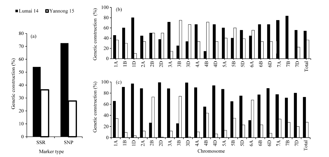 两种分子标记揭示的亲本对青农2号的遗传贡献趋势一致, 但亲本间SSR标记的多态性比例高于SNP标记。鲁麦14对青农2号的遗传贡献大于烟农15, 偏离1∶ 1理论值, 表明育种选择存在较强的偏向性, 两亲本向子代的遗传信息传递以染色体大片段重组和整合为主要方式。
