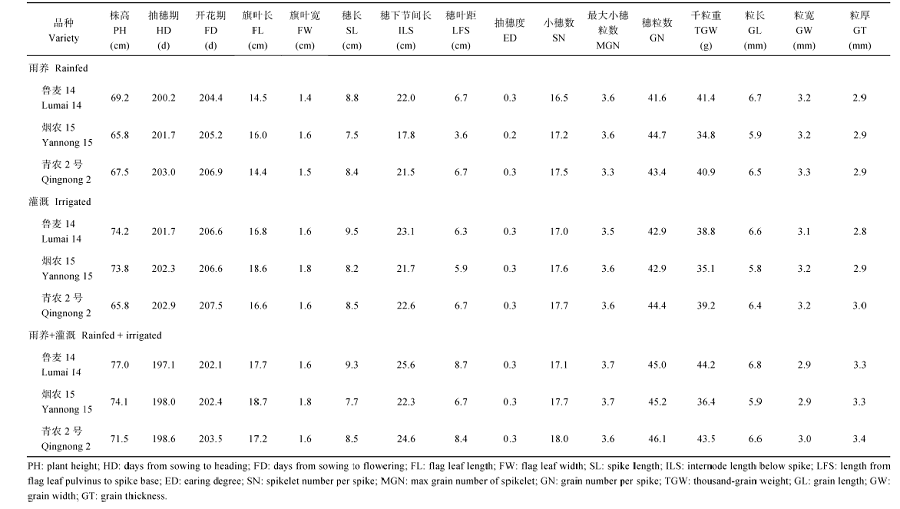 农艺性状最优无偏估计值(BLUP)表明, 青农2号的株高在雨养条件下, 介于亲本之间, 但在灌溉条件和雨养+灌溉条件下, 均低于低值亲本烟农15。青农2号的抽穗期、开花期长于高值亲本烟农15。青农2号的旗叶长和宽跟低值亲本鲁麦14接近。穗长介于亲本之间, 穗下节间长、穗叶距均与高值亲本鲁麦14接近, 低值亲本烟农15的穗叶距在雨养和灌溉条件下差异明显, 而青农2号和鲁麦14均变化较小。青农2号的有效小穗数和穗粒数更接近于高值亲本烟农15。青农2号的千粒重、粒长性状接近于高值亲本鲁麦14, 其粒宽和粒厚在不同水分条件下略有差异, 但均为高值水平。