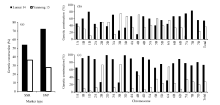 SSR标记[6, 7, 16, 17, 18]和SNP标记[19, 25, 26, 27, 28, 29, 30, 31, 32]分别作为第2代和第3代分子标记, 对作物基因组研究的发展有重要作用。在玉米[34]、葡萄[35]和鼠尾芥[36]上的研究均表明, SSR标记的遗传多样性高于SNP标记, 在揭示遗传分化方面有较高相关性。张利莎等[37]认为EST-SSR和SNP标记对麦芽纯度的检测结果有效且可靠, 但在检测灵敏度、效率和成本方面, SNP标记较EST-SSR标记更具优势。近年来, 随着高通量测序、高密度芯片技术的发展, SNP检测效率快速提升, 成本大幅降低, 在今后的群体遗传学研究中将成为主流[38]。