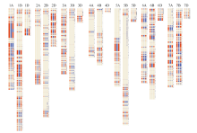 作物品种改良是人类有目的、有计划地通过人工杂交、诱变, 促进基因重组交换、定向改良作物的过程[13]。株型、穗形、高产、优质等质量或数量性状成为育种家的选择目标。这种人工选择对基因组的影响是什么?对青农2号的研究结果表明, 子代基因组大部分遗传信息来自鲁麦14 (SSR标记: 54.11%; SNP标记: 72.55%), 来自另一亲本烟农15的遗传信息相对较少。理论上系谱地位相等的亲本应对子代的贡献一致, 但在本研究中出现“ 偏向性选择” 现象, 而且在染色体水平也存在这种现象, 比如在2B、3B、6A染色体青农2号的遗传信息主要偏向于烟农15, 在1A、1B、1D、2A、2D、3A、3D、4A、4D、5A、6D、7A、7B、7D等染色体主要偏向于鲁麦14。“ 偏向性选择” 现象在作物育种中比较普遍, Lai等[14]发现玉米品种Zheng 58获得父辈亲本478和Inbred X的遗传信息分别为43%和57%, 而获得祖辈亲本8112和5003的遗传信息分别为31%和12%; 邹少奎等[18]对周麦23的研究表明, 亲本周麦13的遗传贡献(63.04%)远高于另一亲本新麦9号(36.96%)。对表型性状目的性很强的定向改良, 应为导致子代遗传信息偏向某一亲本的主要原因。