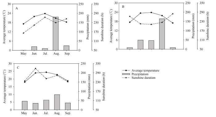 A: meteorological conditions from May to September in Tumd Right Banner in 2022; B: meteorological conditions from May to September in Tumd Left Banner in 2022; C: meteorological conditions from May to September in Tumd Right Banner in 2023.