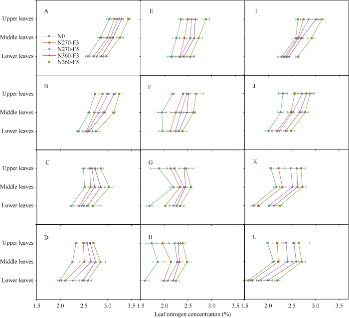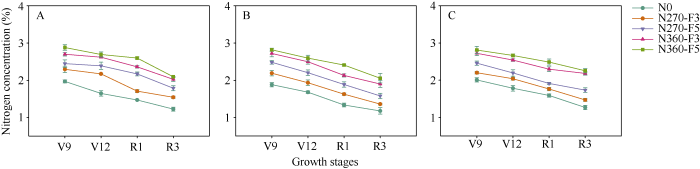 N0, N270, and N360 indicate that the nitrogen application rates were 0, 270 kg hm-2, and 360 kg hm-2, respectively. F3 and F5 indicate that the nitrogen application times are three and five times, respectively.