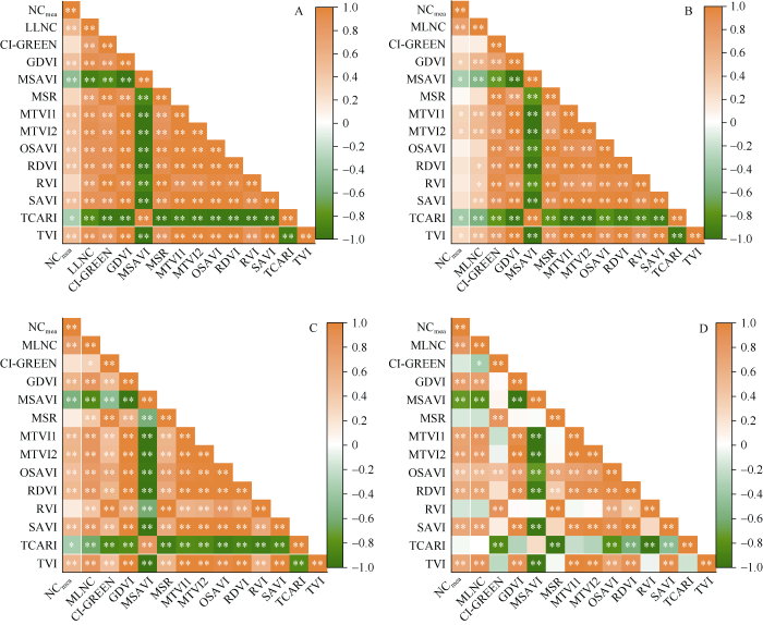 NCmea、MLNC和LLNC分别代表实测冠层氮浓度、中层叶片氮浓度和下层叶片氮浓度; *和**分别表示在0.05和0.01概率水平显著相关。缩略词同