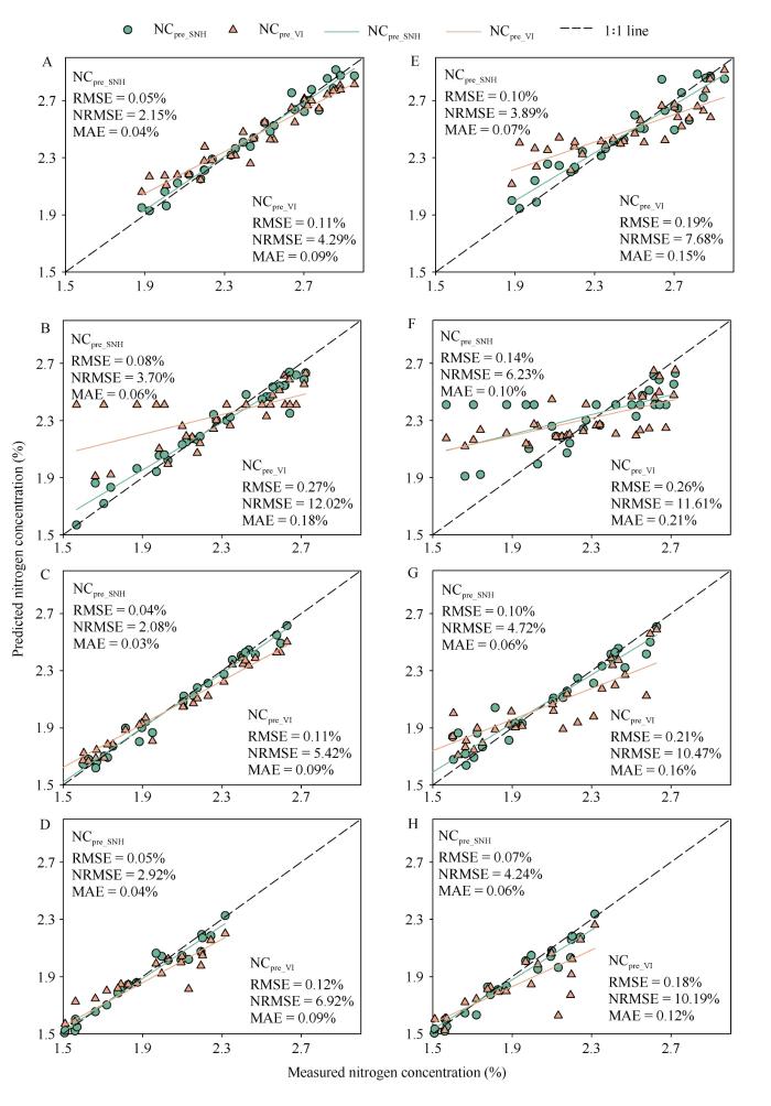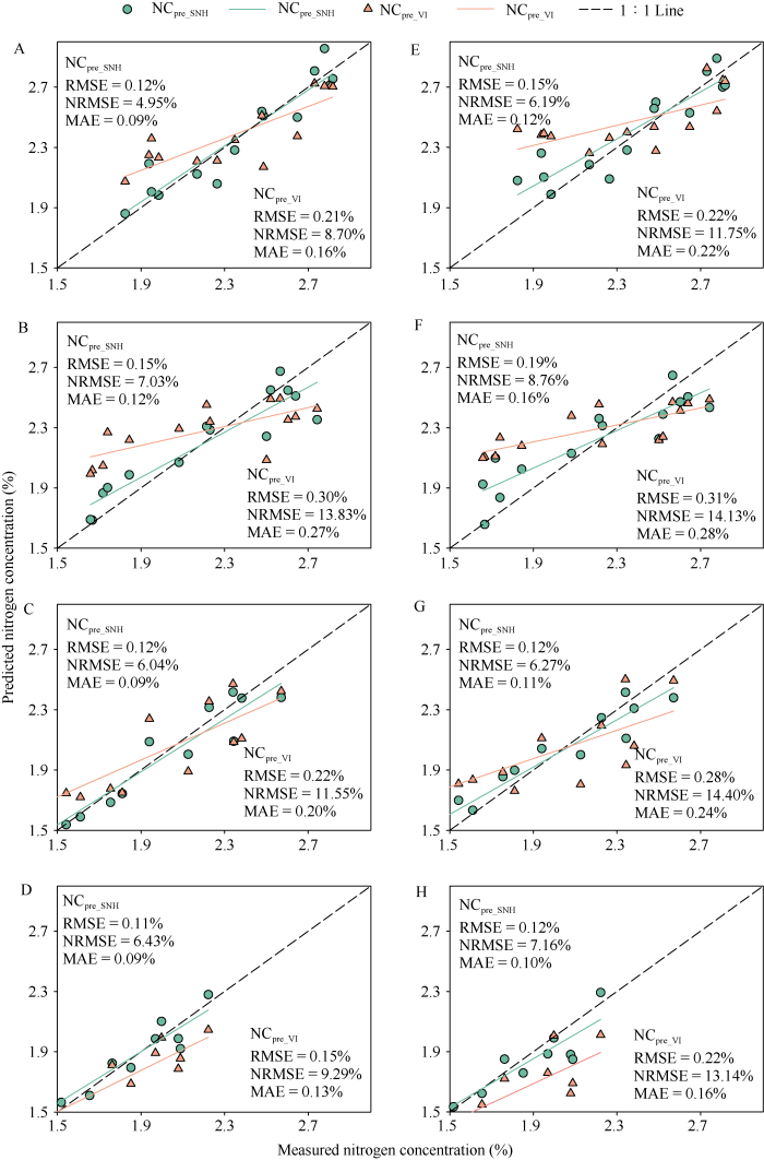 NCpre_VI was used to predict canopy nitrogen concentration based directly on multispectral vegetation index, and NCpre_SNH was used to predict canopy nitrogen concentration considering nitrogen spatial heterogeneity. Abbreviations are the same as those given in