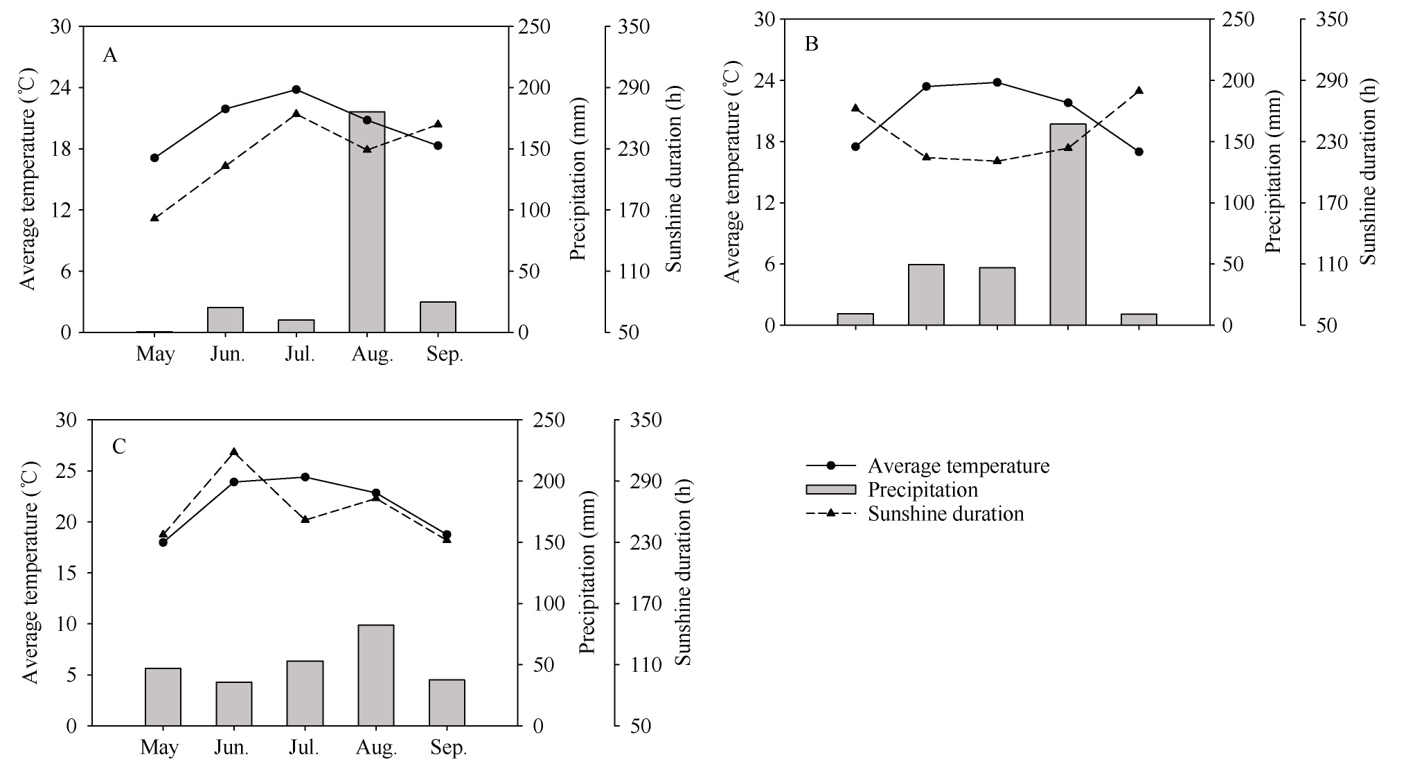 Fig. 2 Meteorological conditions of the test site A: meteorological conditions from May to September in Tumd Right Banner in 2022; B: meteorological conditions from May to September in Tumd Left Banner in 2022; C: meteorological conditions from May to September in Tumd Right Banner in 2023. |
