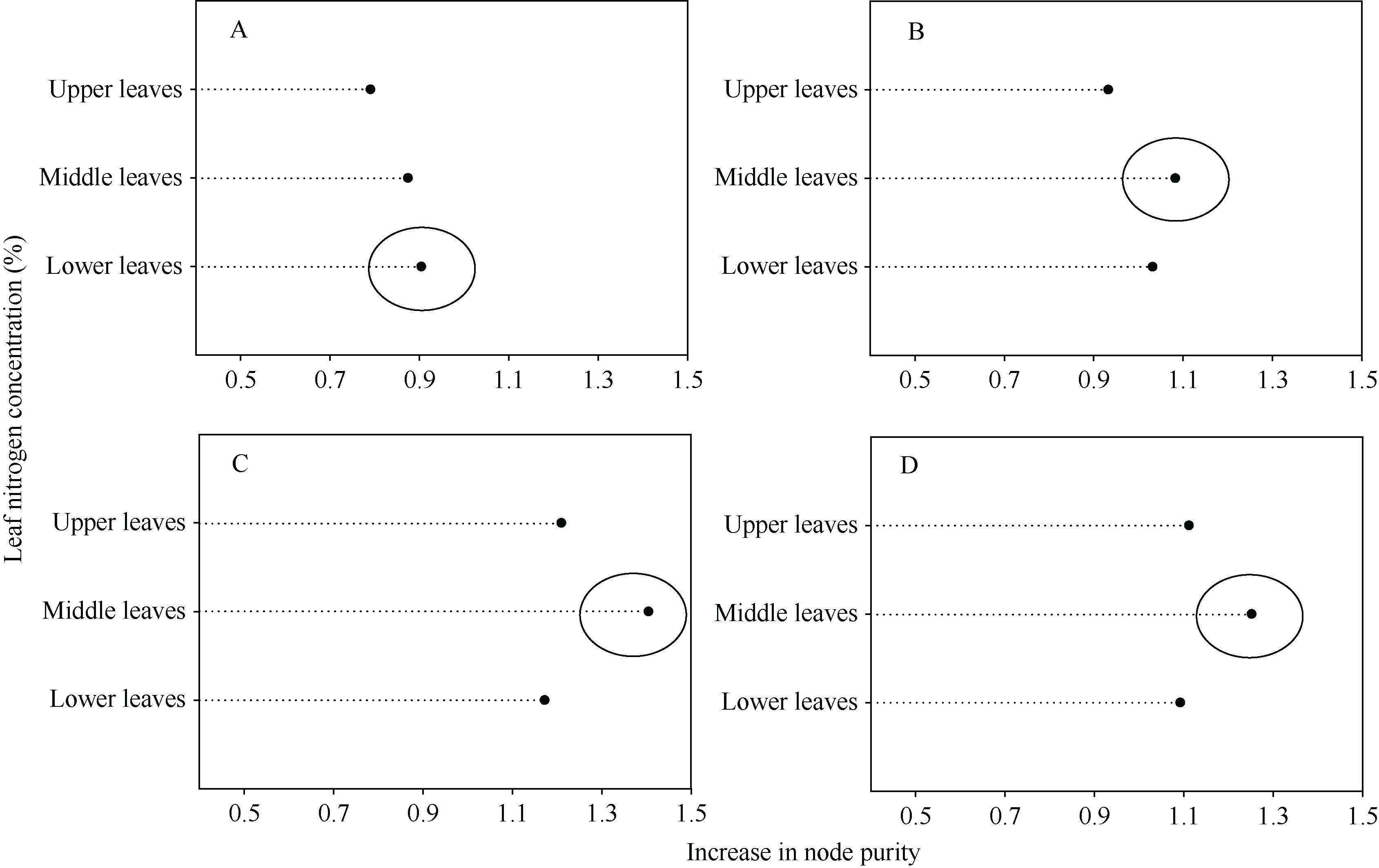 Fig. 6 The canopy nitrogen concentration of V9 (A), V12 (B), R1 (C), and R3 (D) effectively determined by the leaf layer based on the added value of node purity Increase in node purity represents the importance of leaf nitrogen concentration in different strata, and a larger value indicates a greater importance of leaf nitrogen concentration in the corresponding stratum. Abbreviations are the same as those given in |