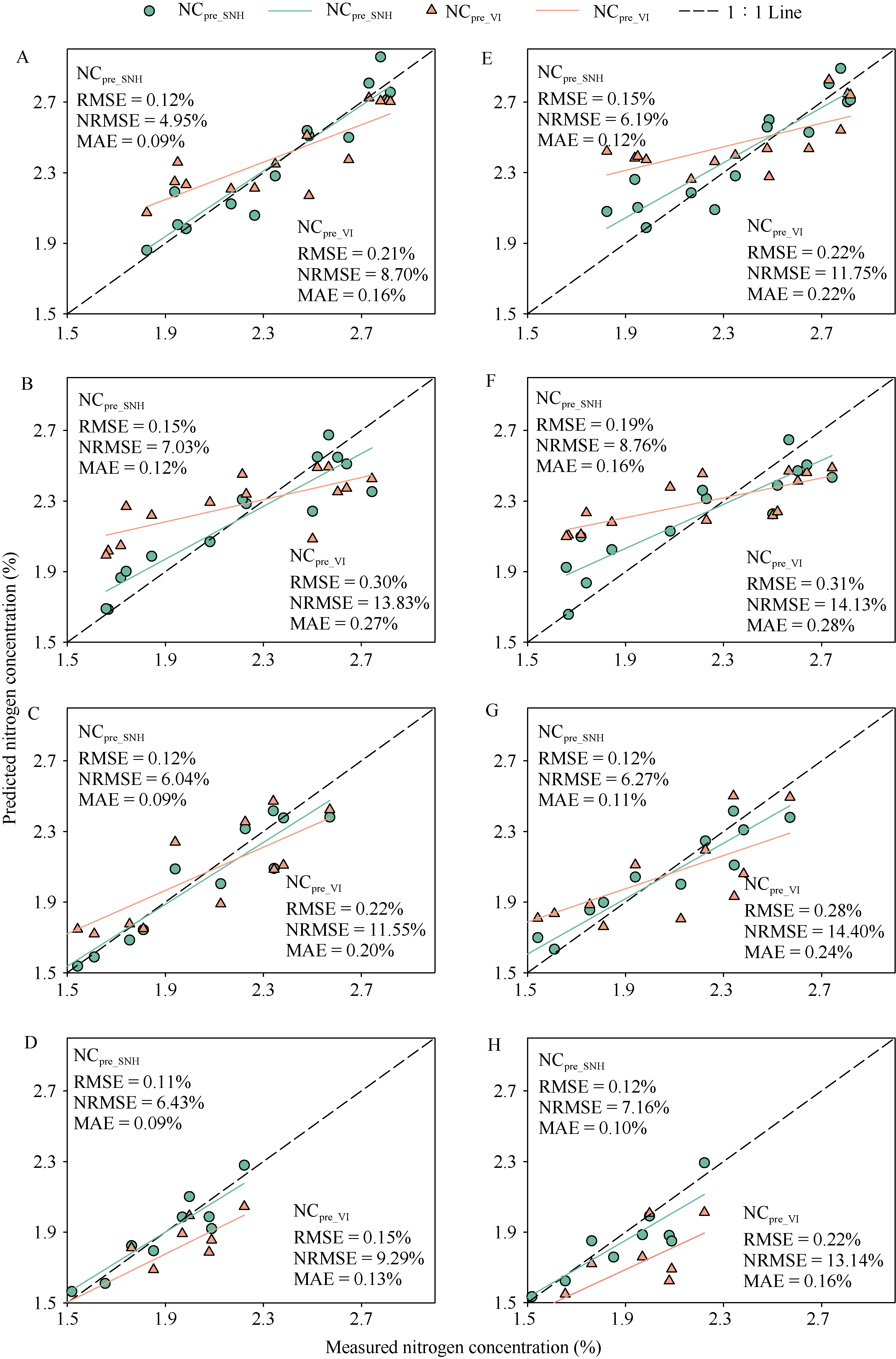 Fig. 9 Performance of Random Forest Regression and Support Vector Regression for estimating canopy nitrogen concentrations in corn V9 (A, E), V12 (B, F), R1 (C, G), and R3 (D, H) in test set Abbreviations are the same as those given in |