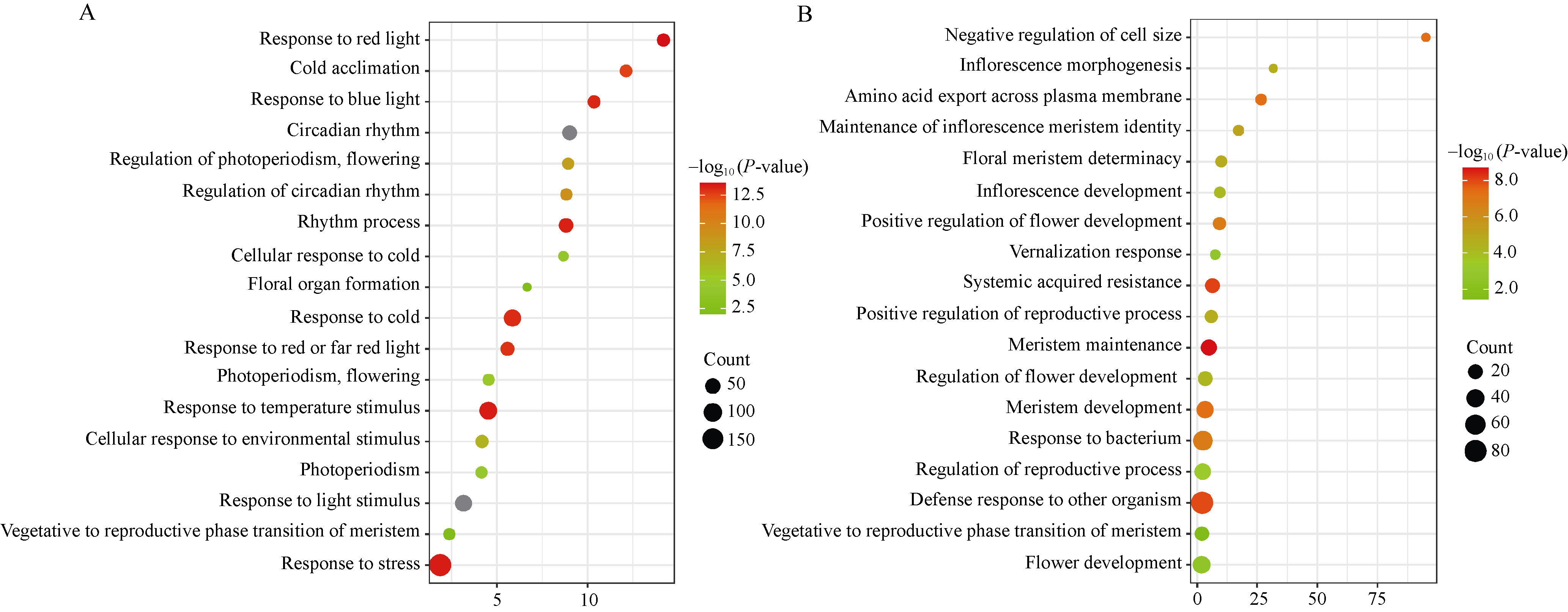 | 图2 差异表达基因GO富集分析 A: 上调基因GO富集分析; B: 下调基因GO富集分析。 |