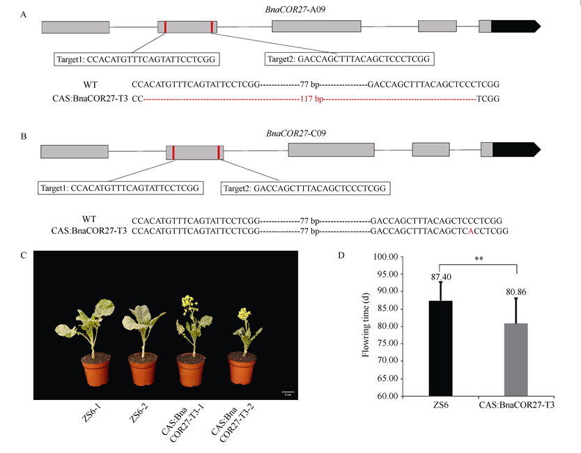 | Fig. 6 Target site mutations and flowering phenotype of transgenic plants A: schematic diagram of BnaCOR27 knockout vector and target mutation on A09 chromosome; B: schematic diagram of BnaCOR27 knockout vector and target mutation on A09 chromosome; C: knockout mutant CAS:BnaCOR27-T3 and control plant ZS6 flowering time phenotype picture; D: knockout mutant lines CAS:BnaCOR27-T3 and control lines ZS6 flowering time bar graph; **: P < 0.01. There is a large deletion on chromosome A09, and a single base is inserted on chromosome C09. Knockout mutant plant CAS:BnaCOR27-T3 blooms about 6.54 days earlier than the control plant ZS6. ZS6: Zhongshuang 6. Bar = 5 cm. |