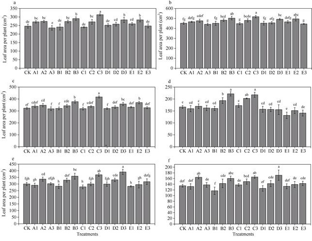 图3 苗期喷施外源物质对迟播油菜单株叶面积的影响 处理同表1。不同小写字母表示处理在0.05水平下差异显著。图a~c是苗期喷施外源物质对迟播油菜2022-2023年苗期(a)、蕾薹期(b)和花期(c)单株叶面积的影响; 图 d~f分别是苗期喷施外源物质对迟播油菜2023-2024年苗期(d)、蕾薹期(e)和花期(f)单株叶面积的影响。