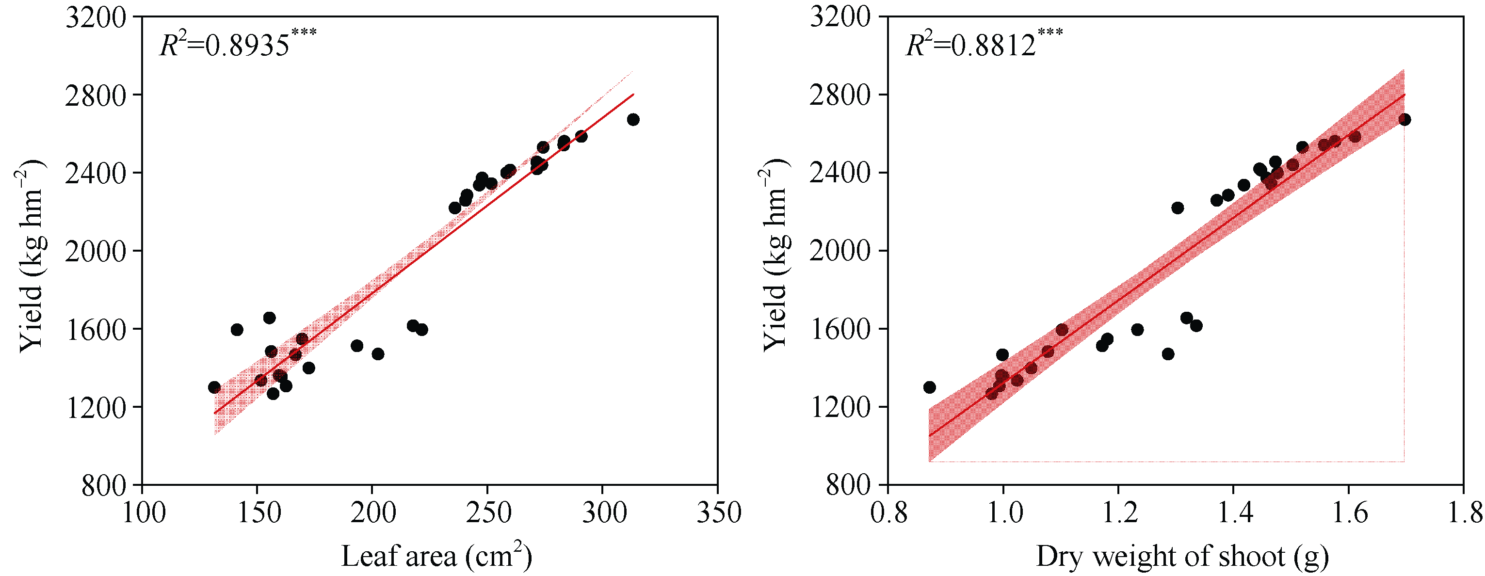 | 图4 产量与越冬期迟播油菜叶面积和地上部干重的相关性分析 ***代表在0.001水平下相关性显著。 |